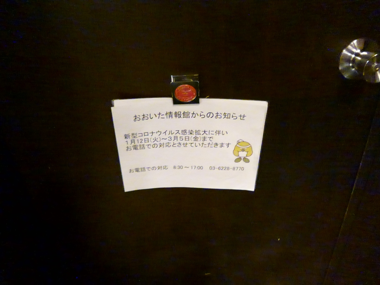 観光情報を求めて足を運んだのですが、8階まで行くと「コロナにつき電話のみでの対応」の貼り紙が。当面、足を運ぶ際は事前に営業確認を行うことをお勧めします。
