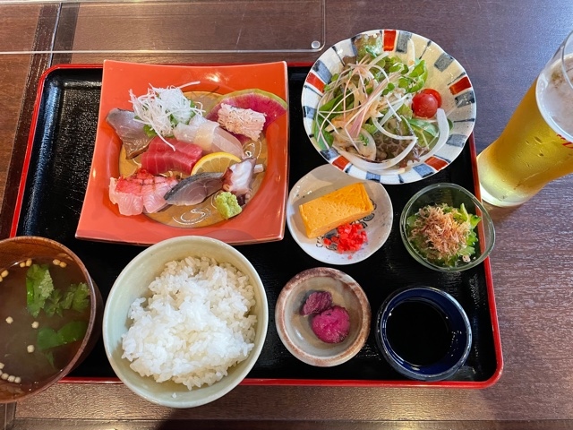 南海本線岸和田駅から伸びる岸和田駅前通商店街にある居酒屋さんです。岸和田の散策を終えて、ここでランチにしました。岸和田港にあがった魚料理が中心の店ですが、鍋料理の美味しいらしいです。今回は厚かったので刺し身定食にビールです。