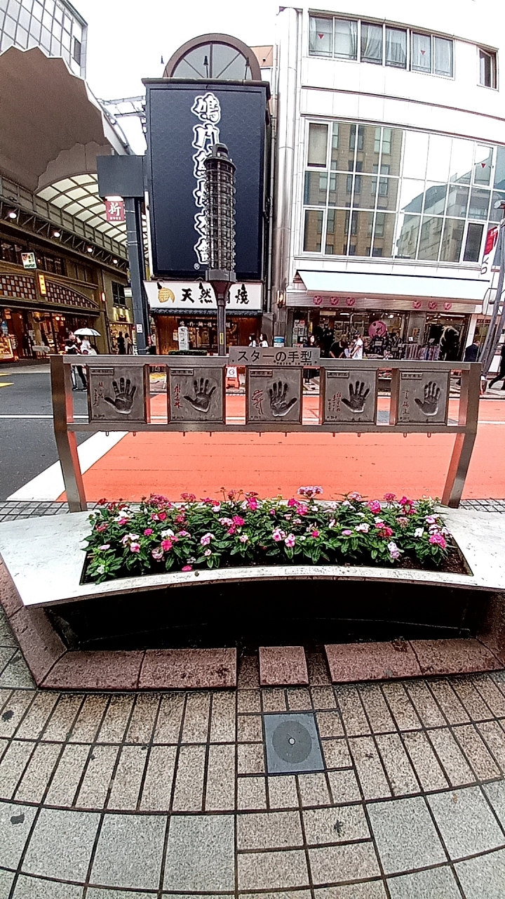 浅草オレンジ通りの歩道には、歴代のスターの方々の手形が並んでいます。実物大の手形が飾られていて、思ったよりも小さな手形に驚いたりもします。