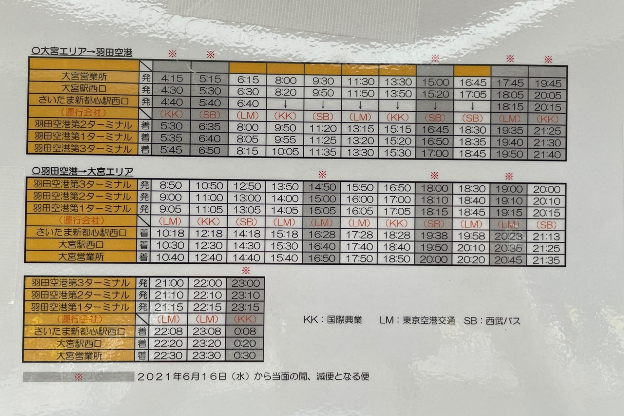 ドル箱路線の大宮駅〜羽田空港便も、約半分くらいでの本数で運行されています。