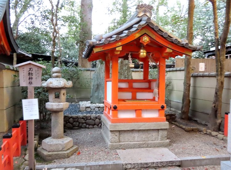 八坂神社にある境内社で、本殿の北側に並んでいるうちのひとつです。製鉄・鍛冶の神とされる天目一箇命(あめのまひとのかみ)が祀られています。苦難を断ち切り、未来を切り開く、刃物神社とわかりやすくアピールしてありました。