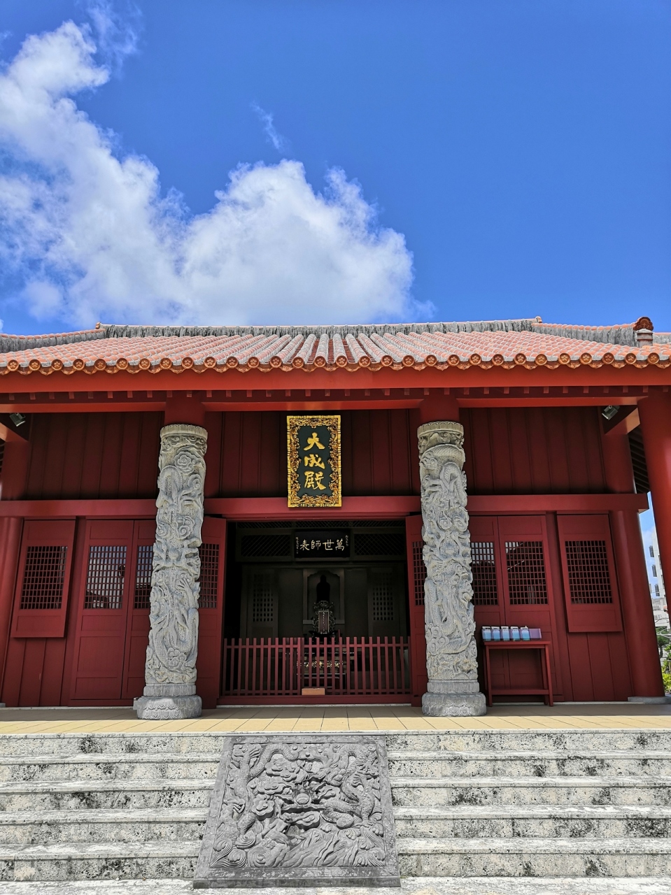 県庁前から波上宮に歩いて行く途中で立ち寄りました。儒学の祖である孔子とその門弟である顔子・曾子・子思子・孟子を祀る廟です。もちろん中華風の建物なんですが、本土にあればすごく目立つのでしょうが、沖縄になると赤茶色の建物も結構自然な感じがしますね。