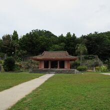 波の上ビーチから波上宮を周って、県庁前駅に向かって歩いていると、緑の芝生に赤い建物が映えた建物がありました。中華風の寺のようでした。門が開いていて、自由に入れるようになっていました。思ったより広い敷地の奥にポツンと建っていました。