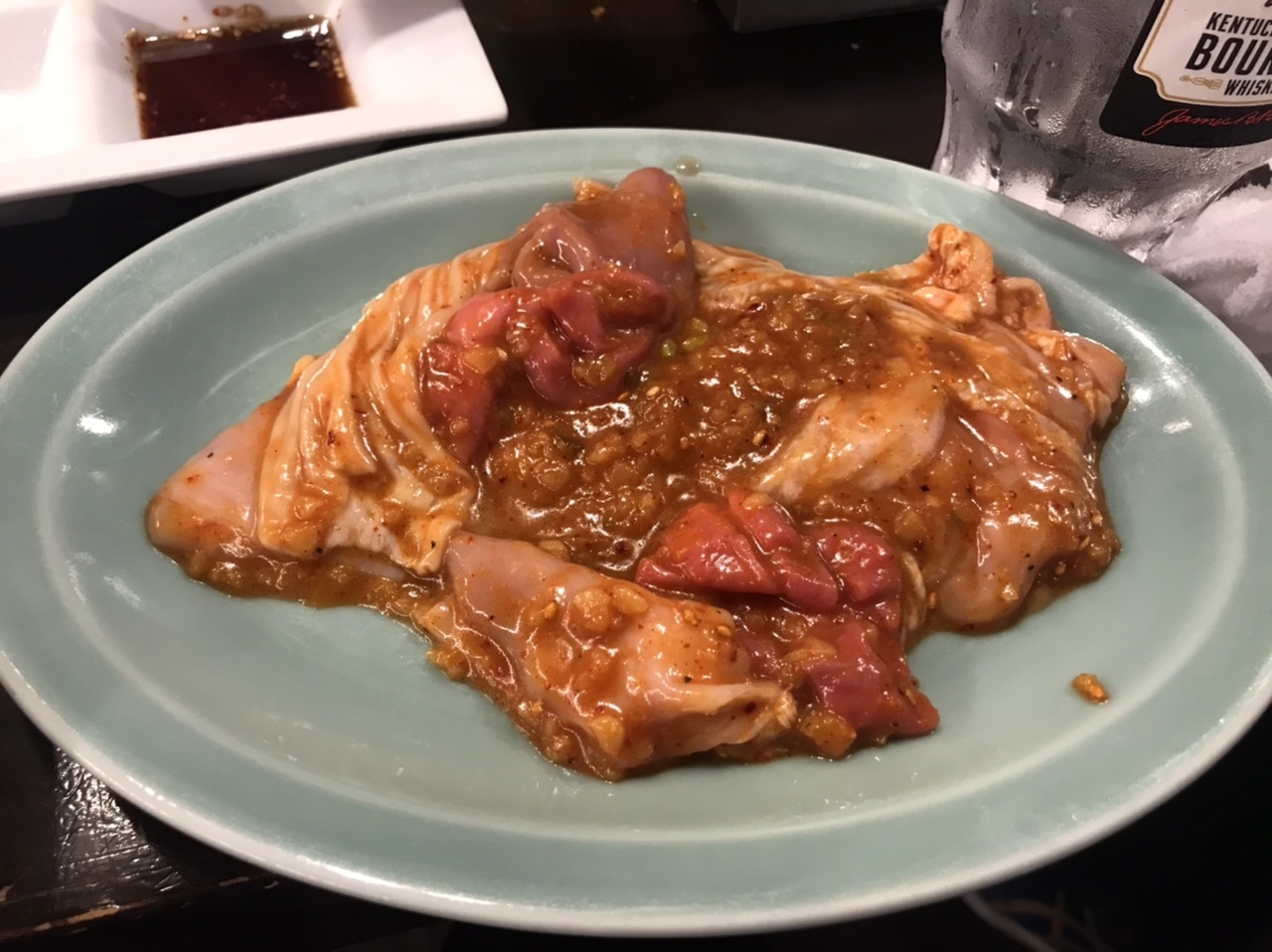 中野栄駅近くにある焼肉店です。子供達を連れて夕食を摂りました。ホルモン推しの店のようで、僕は気仙沼ホルモンをいただきます。味付きホルモンをキャベツの千切りに載せていただく料理です。 子供達はカルビや冷麺を食べ、お値段もそれなりに。肉質は食べ放題の店などより美味しい気がします。