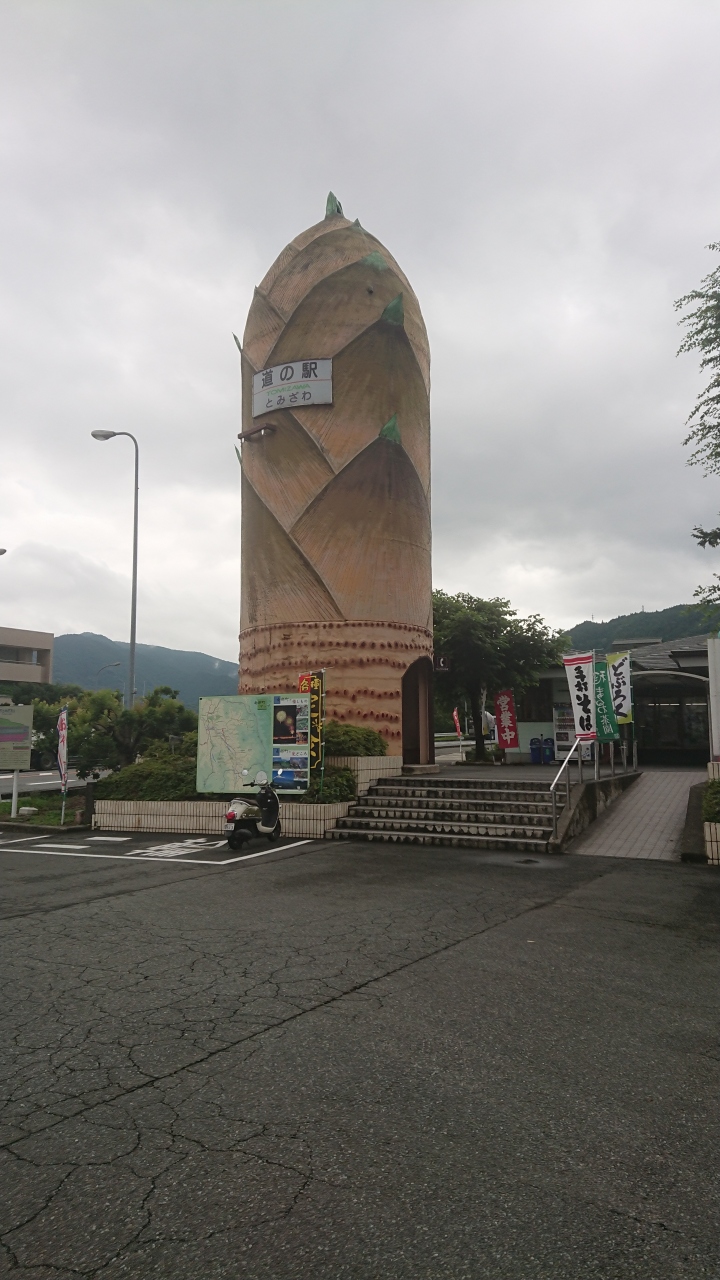 富士川沿いを走る国道52号沿いにある山梨県内の道の駅です。国道52号沿いには複数の道の駅があり、道の駅スタンプラリーをしていると、道の駅とみざわの巡り方を計画的にしないと効率的にスタンプラリーが進行しないキーポイント的な道の駅です。施設は、数ある道の駅の中でも簡素な道の駅です。新しくもなく小規模なドライブインという雰囲気です。巨大な筍のモニュメントの内部は公衆電話でした。