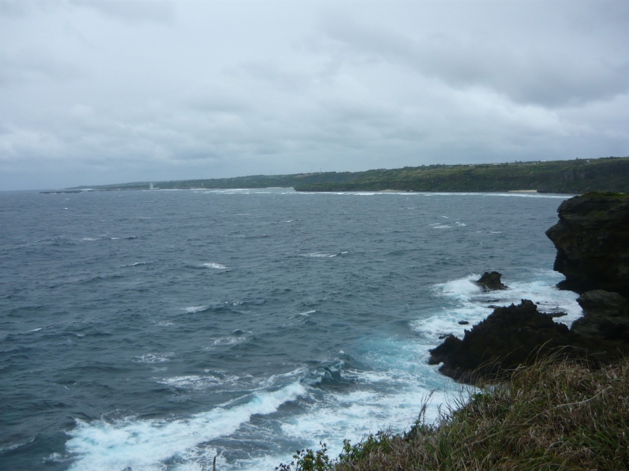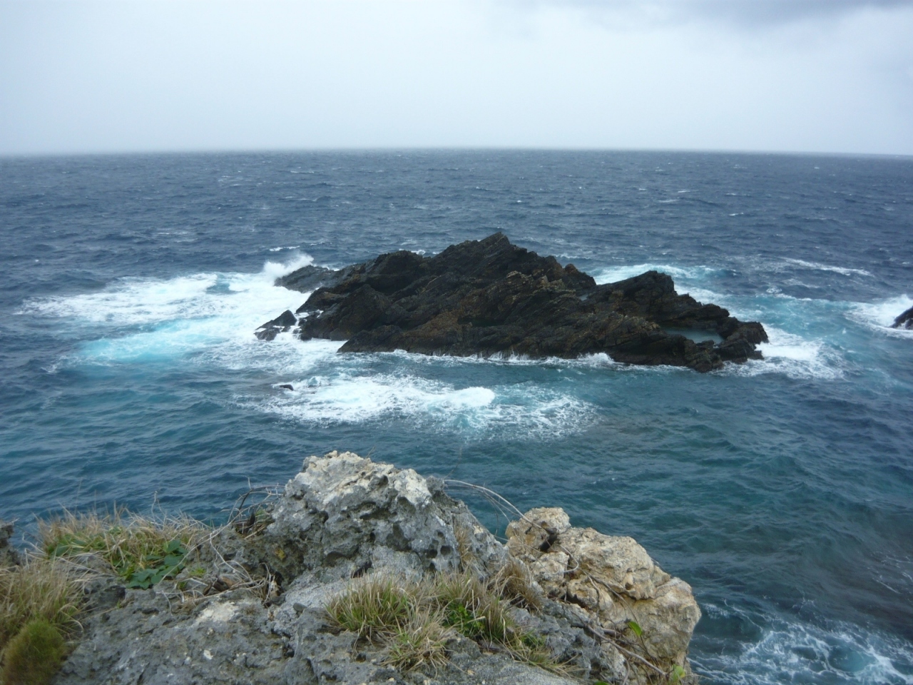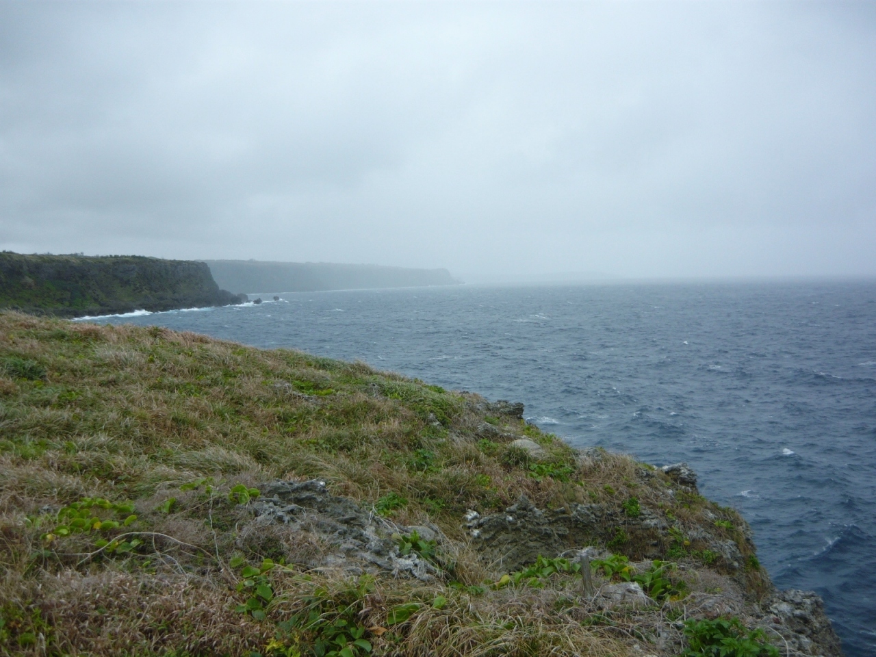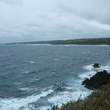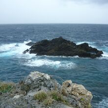 草原のような岬の先端からは断崖絶壁と透明度抜群の海を見渡すことができました。岬の沖合には、太平洋戦争の時に軍艦に間違えられて爆撃を受けたという軍艦岩がありました。駐車場はありますが、ベンチやトイレはありません。天気が良ければ、是非、訪れたいビューポイントです。