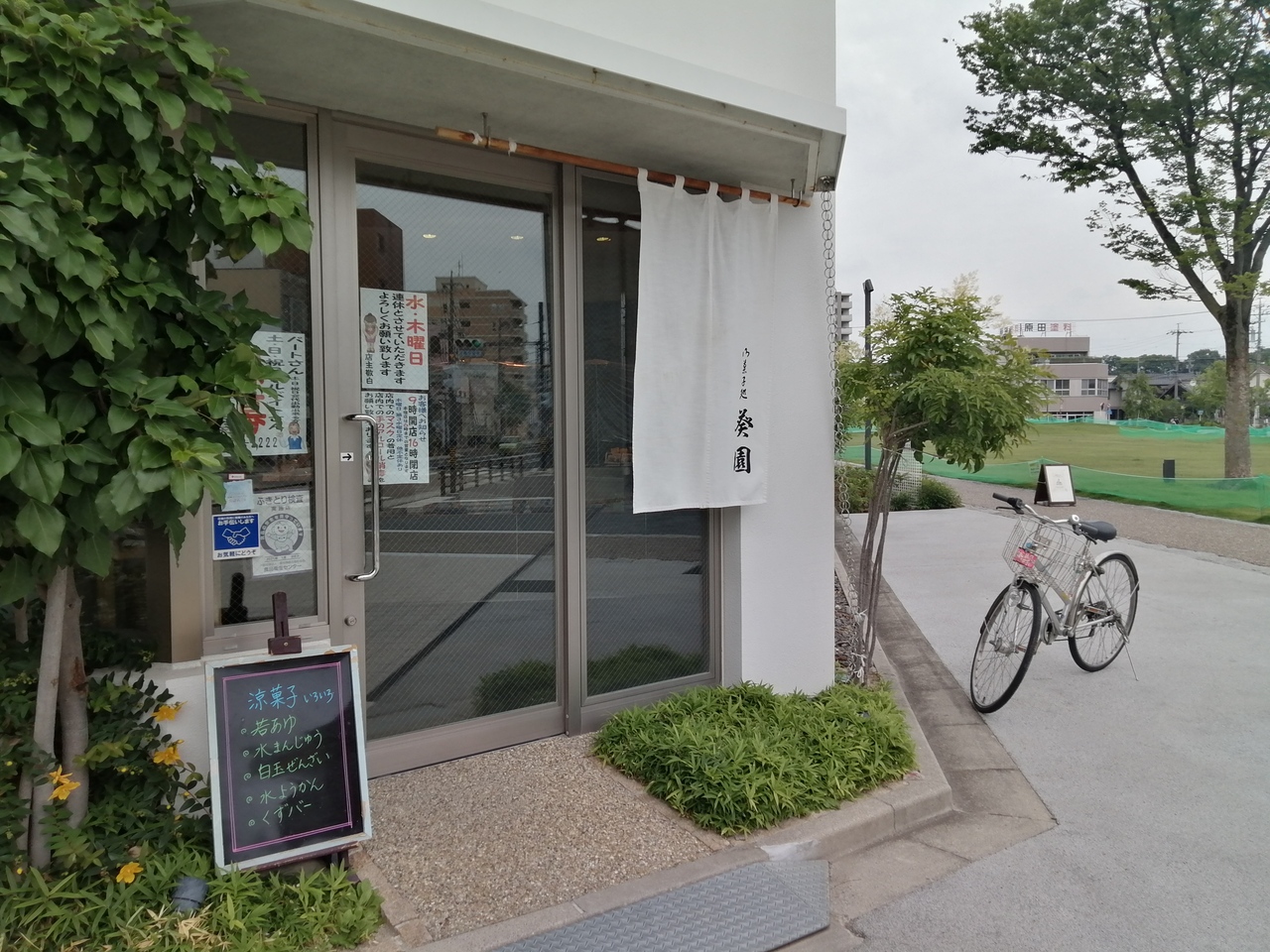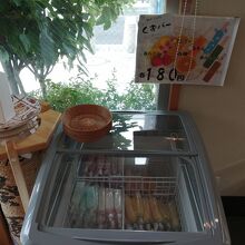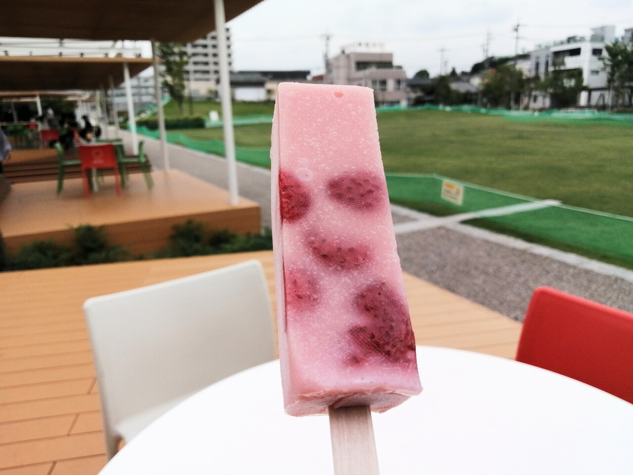 前回4月に訪れたときは、まだシーズン前ということで「くずバー」は販売前。今回は無事ゲットできました。全8種類の中から「いちごミルク」をチョイス。お値段税込180円(現金払いのみ)。すぐ隣りの籠田公園のテーブルでいただきました。