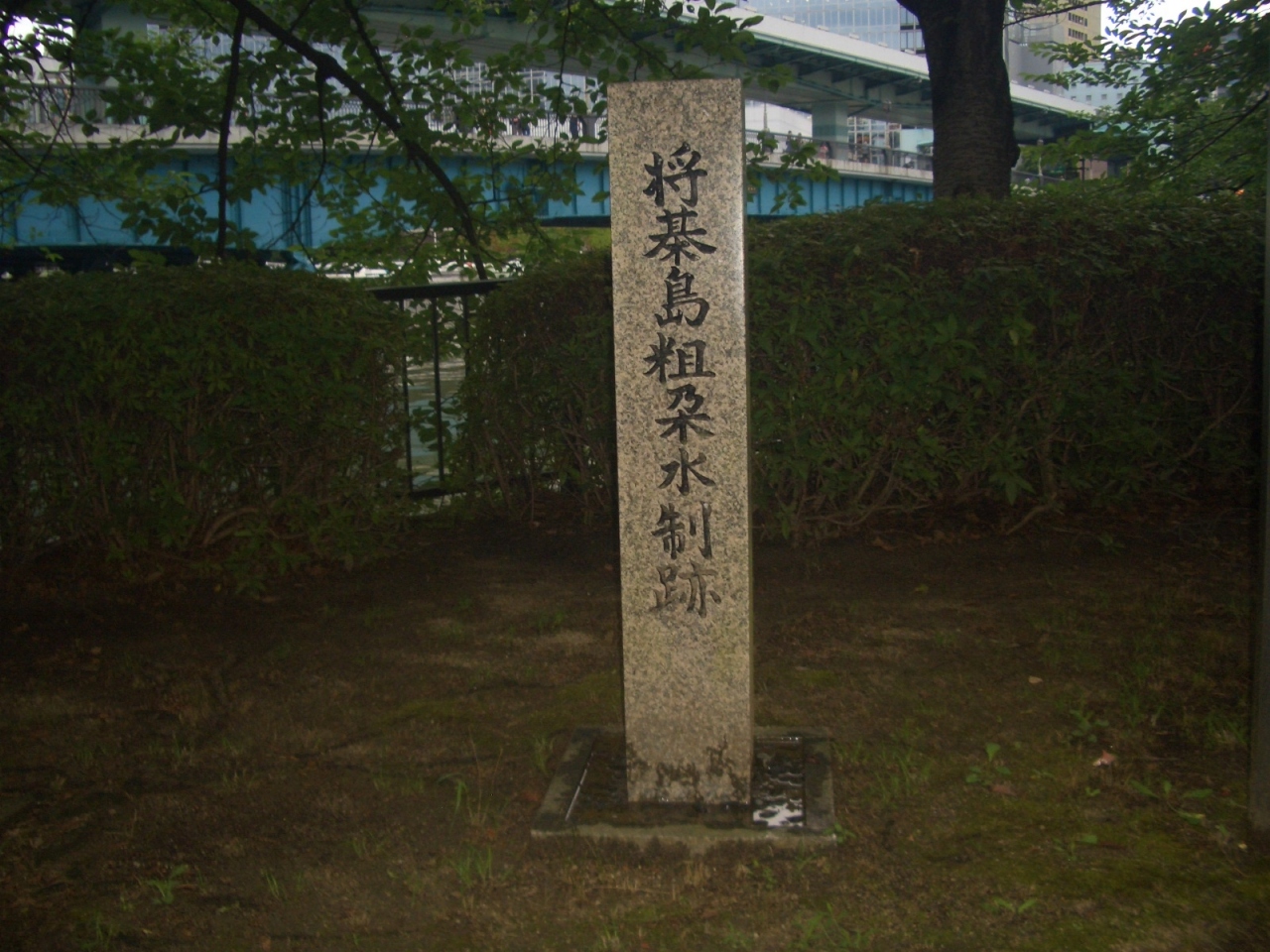 将基島粗朶水制跡碑は、南天満公園の天満橋の近くにある石碑です。石碑と説明のプレートがあります。この石碑は、1874年にオランダ人技師ヨハニス・デ・レーケ等により築造された、旧淀川寝屋川合流部の隔流堤の跡を示す石碑とのことです。興味がある方は見学されては如何でしょうか。