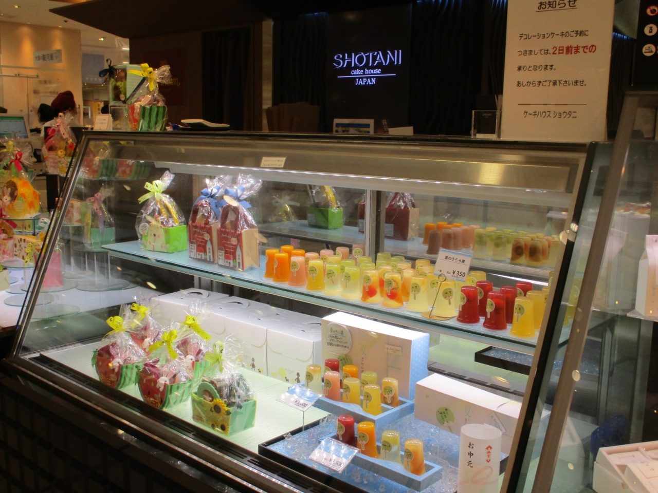 松坂屋高槻店の中にショウタニのお店があります。ケーキのお店です。本店に比べるとスペースは小さいですが、ショーケースにはおいしそうなケーキやスイーツがずらり。あじさいゼリーや、かえるのスイーツ「夏のケロちゃん」など季節感があるものもありました。買いやすいお値段でおいしくてお気に入りです。