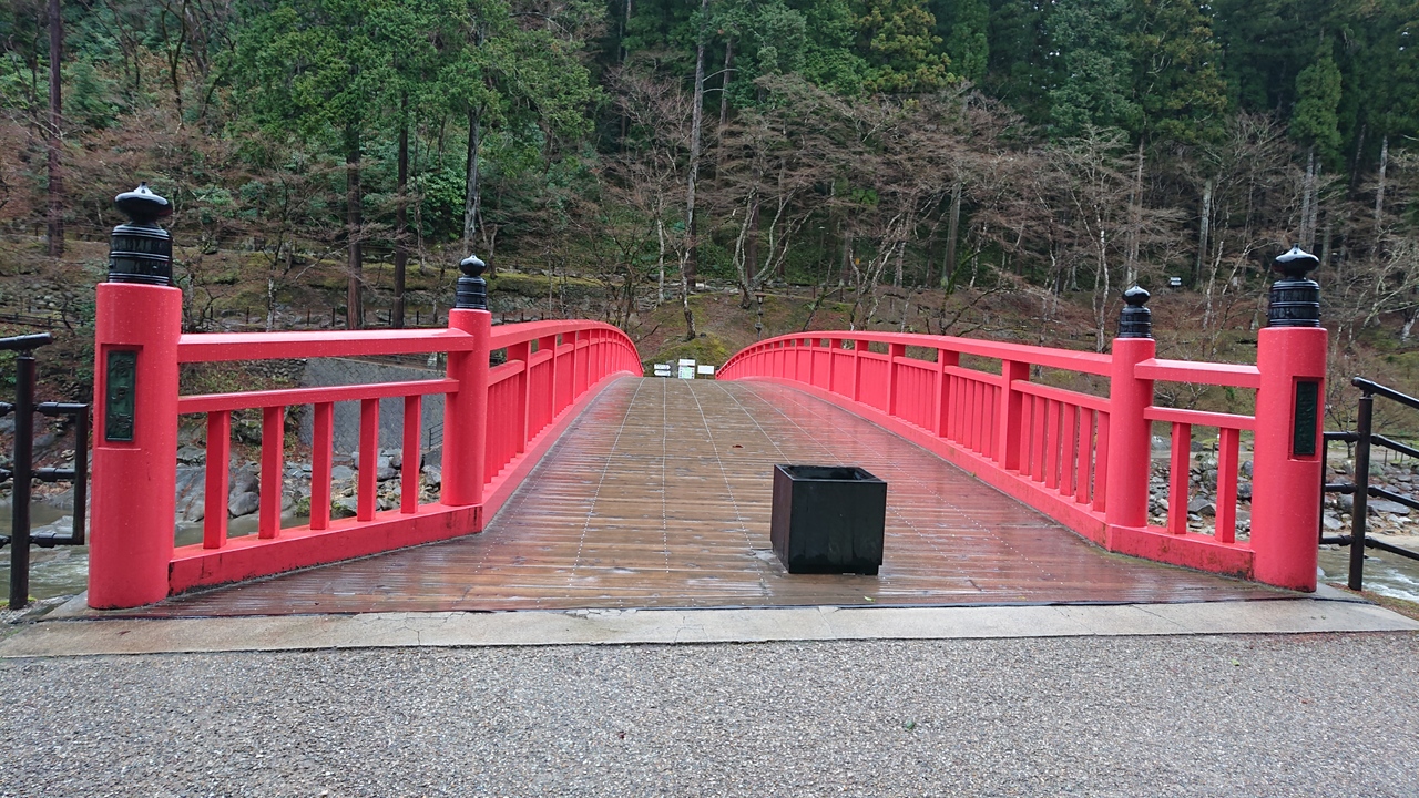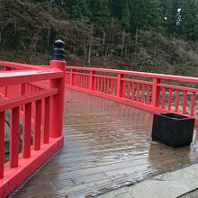 天気のすぐれない3月中旬の日に訪問しました。紅葉の時期には人であふれかえる待月橋もさすがに人出は少なかったです。少し離れた位置から橋を眺めると、曇り空の下、橋の赤色が鮮やかに見え、これはこれで趣のある光景だと感じました。