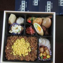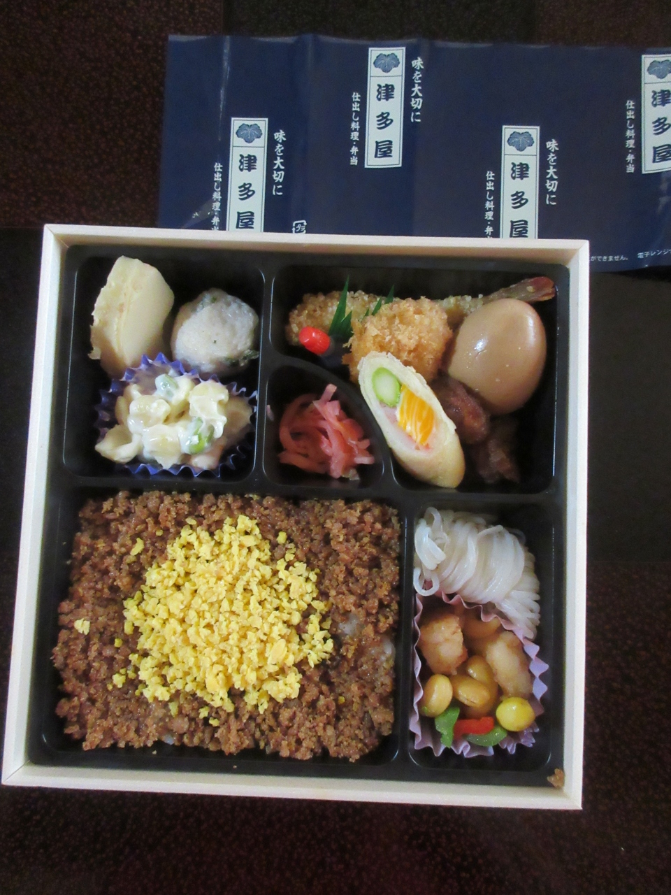 西武池袋本店の地下食品売り場で買い物をした後、昼食に津多屋の二色そぼろ幕の内弁当を買いました。リトルシェフに置いてある他の弁当と比べると容器が大きかったです。卵と鶏のそぼろがたっぷりのっているご飯は容器の約三分の一で、他は色々なおかずが入っていました。カシューナッツや銀杏などと揚げたイカの中華炒め、濃い味のホタテ串揚げ、煮卵、薄味の筍煮、マカロニサラダの他にも揚げ物などがありおかずの種類が多いのが特長です。濃い味付けや薄い味付けがあり楽しめました。他にも気になる弁当があったのでまた利用したいです。