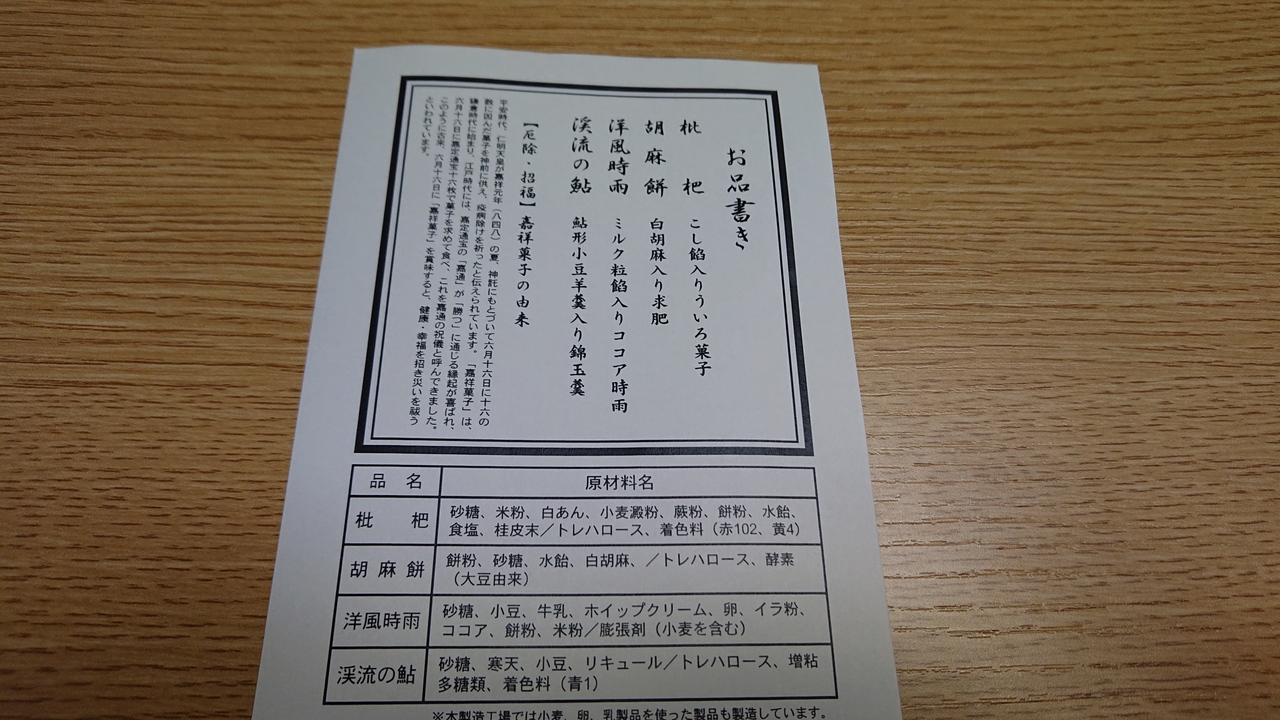 なお、丁度大売り出しが行われており、プレゼントとして、嘉祥菓子のセットをいただきました。そのうち、洋風時雨は、ココアと餡子の組み合わせが新鮮で、思わずうなりました。