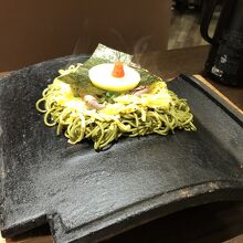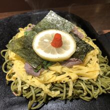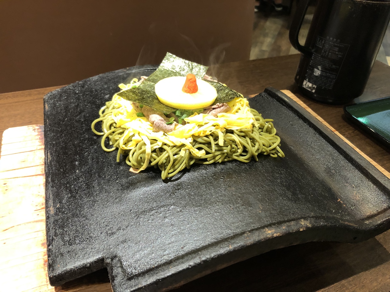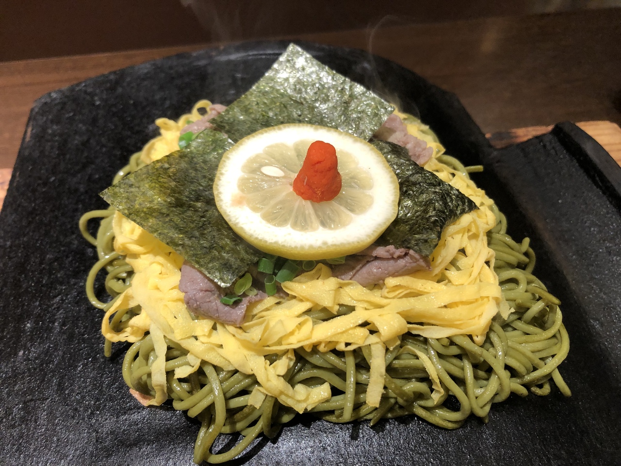瓦そばは、直火で温められた瓦の上に鉄板で炒められた茶蕎麦、さらにに牛肉、錦糸卵、海苔、レモンに紅葉おろしが添えられたもの。カツオと昆布の深み豊かな麺つゆで食べる蕎麦は香りが良く、牛肉によるボリューム感もあり、かつ紅葉おろしでさっぱりいただけます。時間が経ち過ぎると火が入り過ぎて、蕎麦のパリパリさの硬さが増すので注意。最後まで熱々なのは嬉しい。