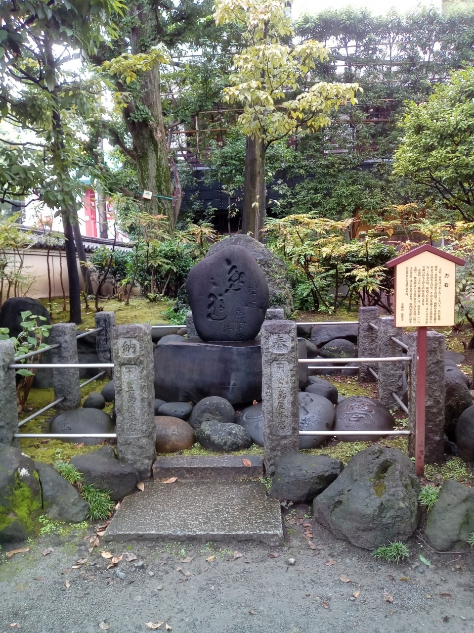 「浅草寺」の境内に「力石」がありました。1874年に熊治郎が持ち上げた百貫(約375キロ)ほどの力石だそうです。物凄い怪力です。