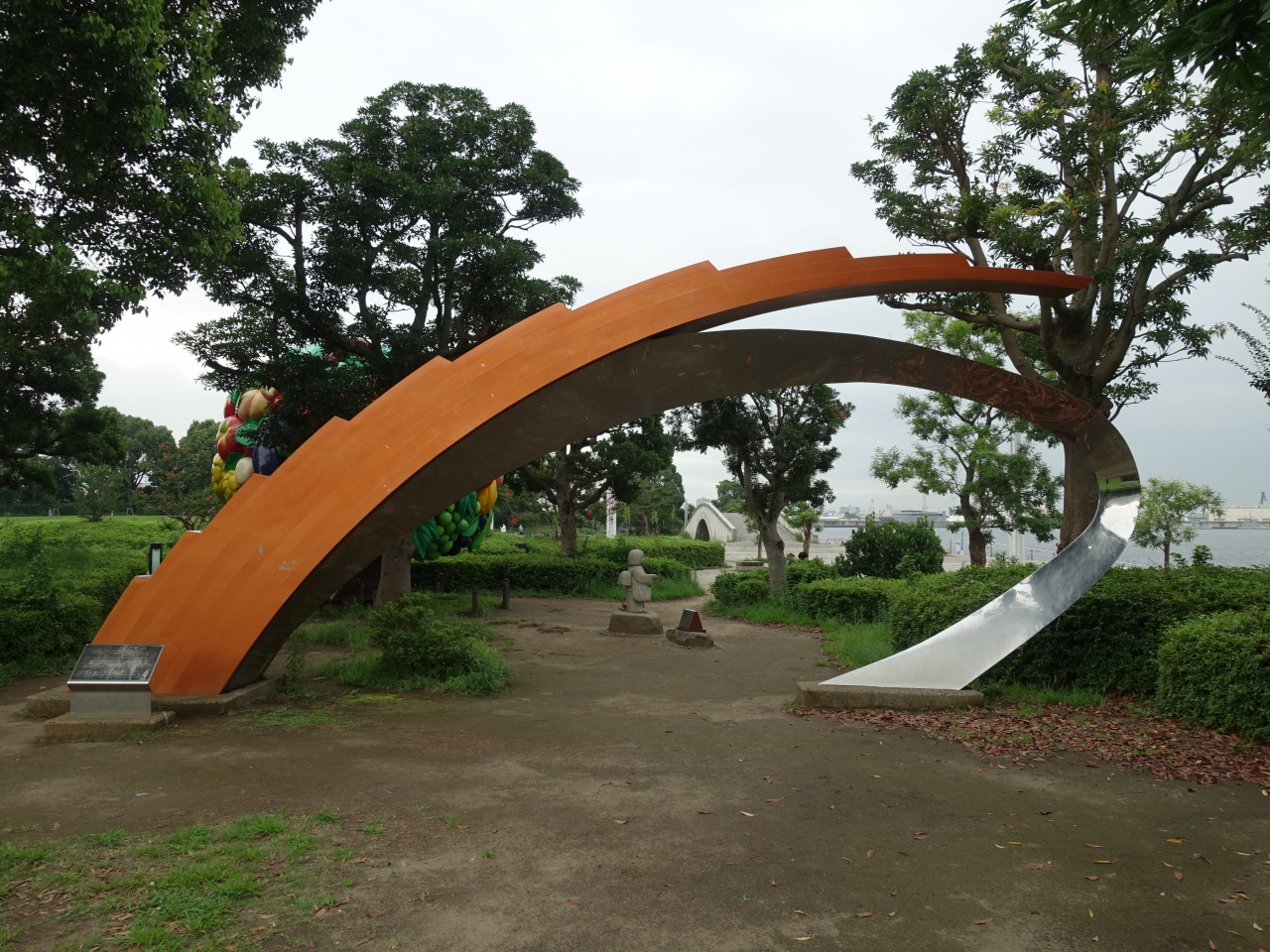 「日本ブラジル修好100周年記念碑」は、臨港パークの一画に1995年に設置されたものです。案内書きによると、ブラジル・サンパウロのパンアメリカン広場に同じ形の記念碑が設置されているということです。地球の裏側ともいえる日本とブラジルながら、多くの日本人が移民として移り住んでいたり近い関係にあります。個人的に感慨深く印象的な記念碑でした。