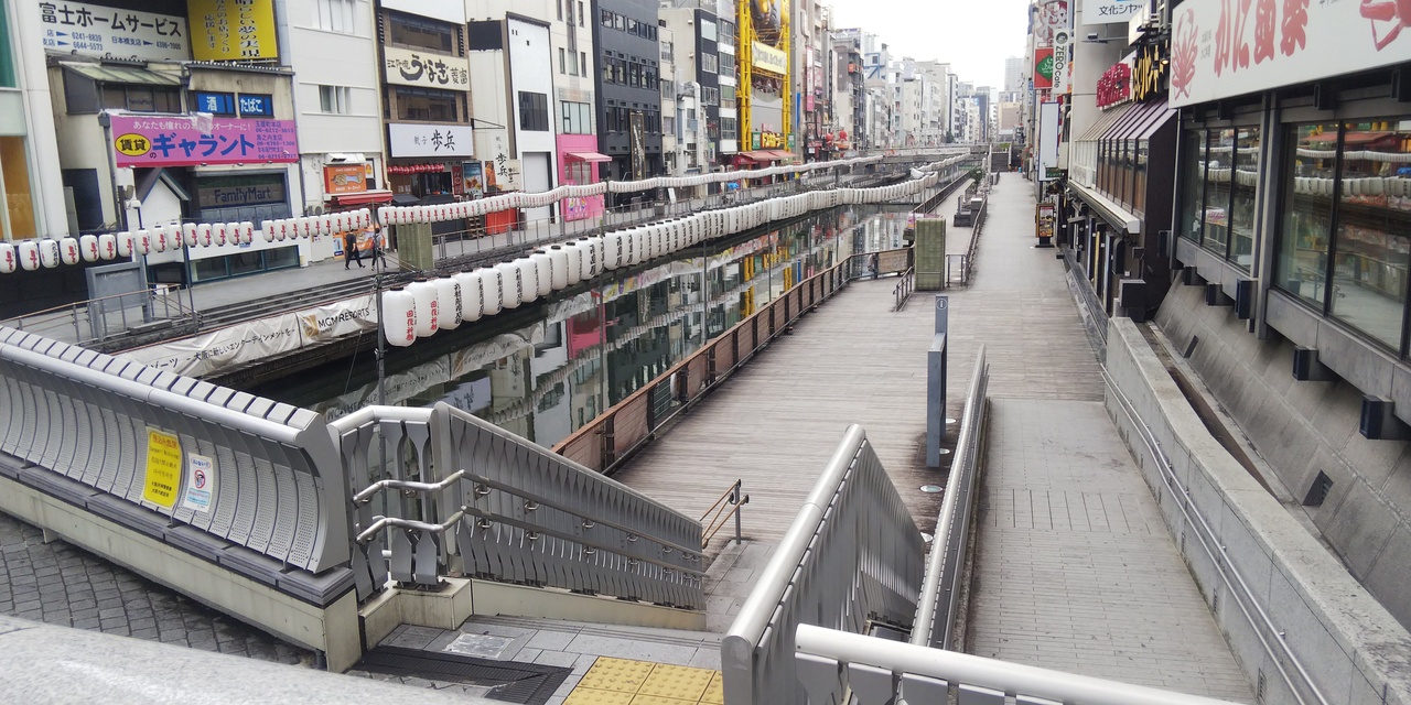 とんぽりウォークは大阪ミナミの道頓堀川の南北にある遊歩道です。7月はじめに行きましたので、下旬にある天神祭の提灯が並んでいました。有名なグリコのネオンなどもみることができます。最寄りの駅は南海電鉄や大阪メトロ、近鉄電車のなんば駅です。