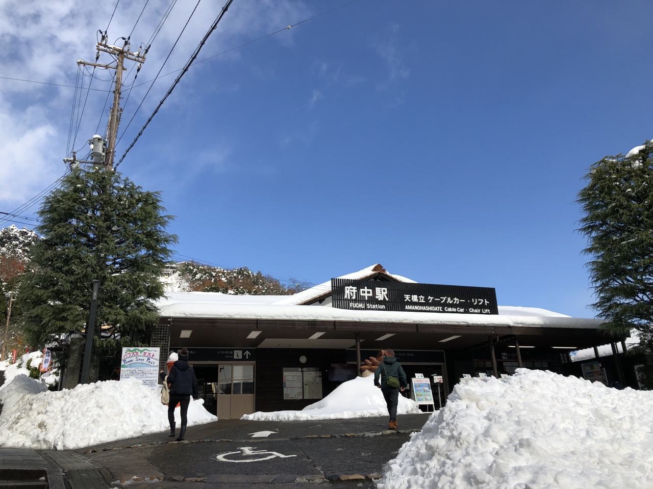 日本三景のひとつ天橋立を展望する「 天橋立傘松公園 」へは、ケーブルカーで約4分・リフトで約6分で到着します。乗車券は共通です。前日降った雪の影響でリフトは運休でした。駐車場からふもとの府中駅までもかなり傾斜のある坂道でしかも所々凍っていて怖かったです。