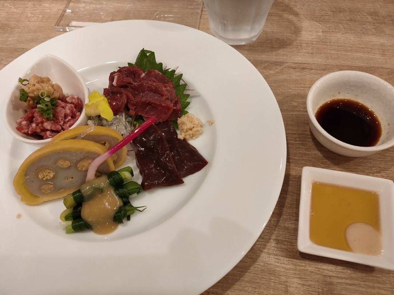 今まで食べたことがなかったのでどこかで食べたいと思っていたら熊本駅横の肥後くまモン市場の中でたまたま馬刺しのお店を発見。ちょうど、お酒と熊本の他の名産も載せたプレートセットが出ていたので食べました。きれいな盛り付けで名産をちょっとずついろいろ食べられて満足でした。