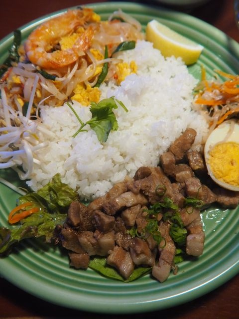 タイの麺料理パッタイと、台湾のご飯メニューの魯肉飯(ルーローハン)の組み合わせ。