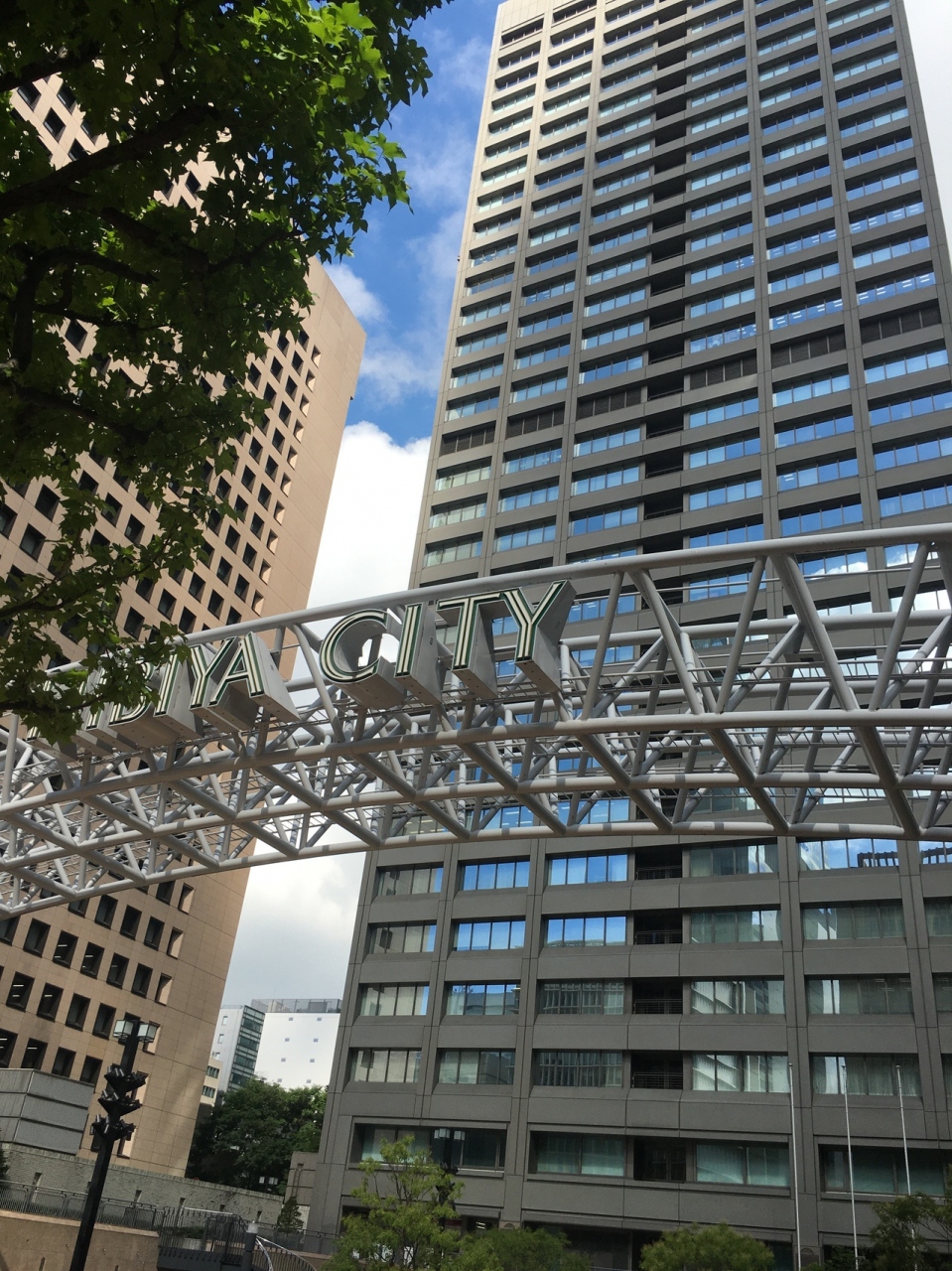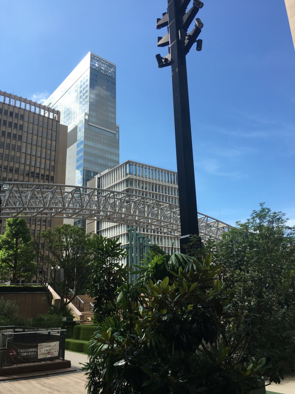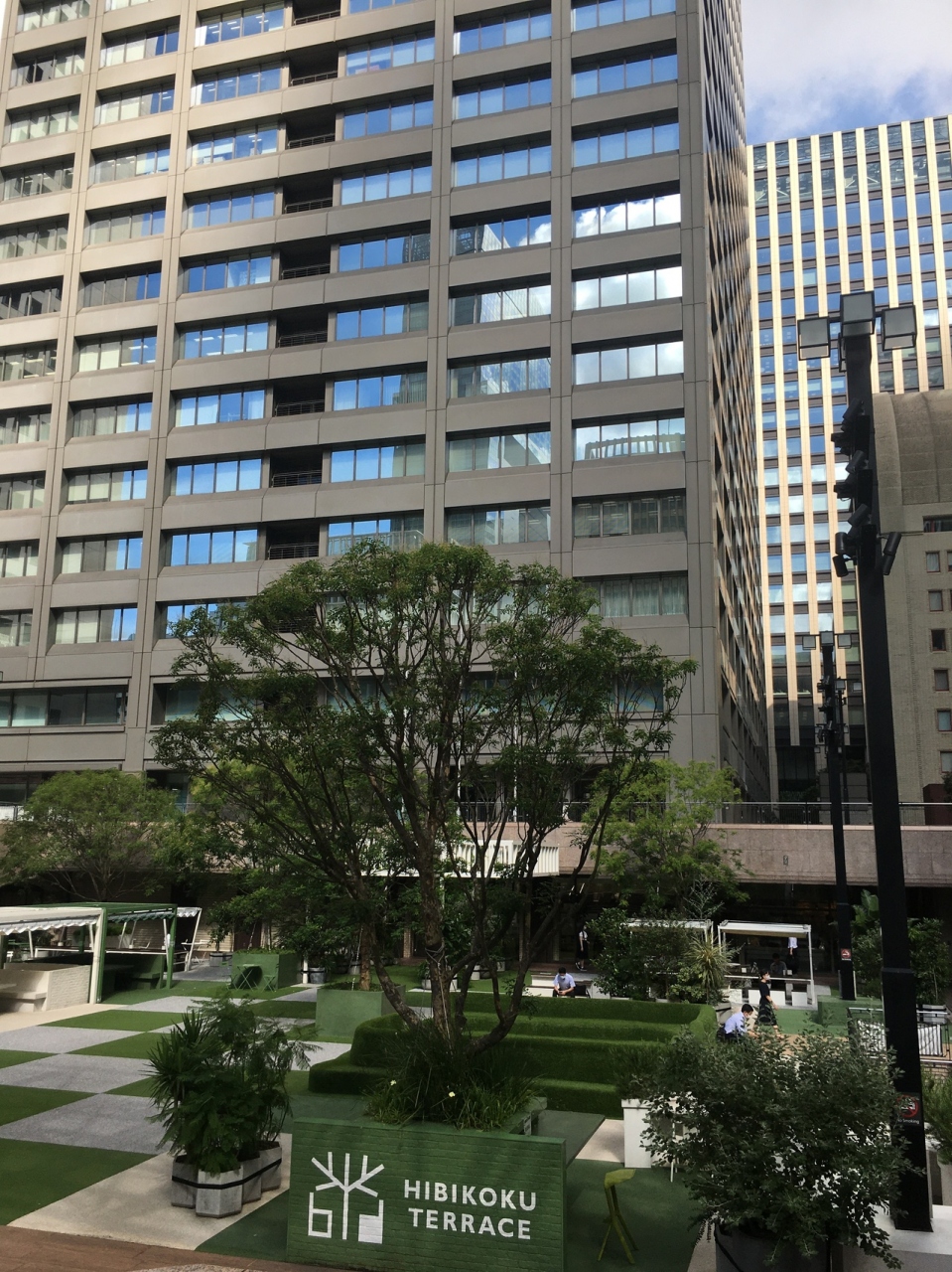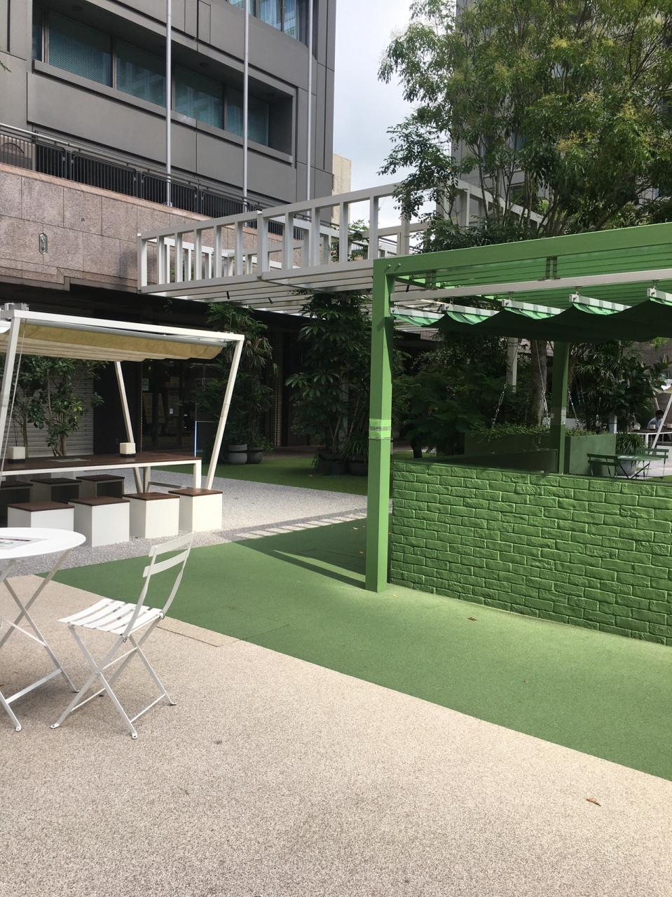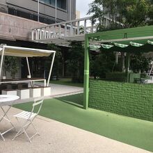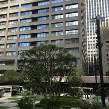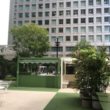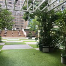 ビルに囲まれた広場で地上より階段で降りた場所にある中庭です。人工の芝生や木々があり、椅子、テーブルがたくさん置いてあるので、ビル内で弁当を購入して寛ぎました。都会にありながら、都会を忘れられる場所でした。