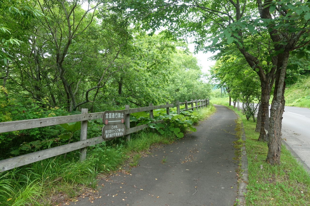 道路の左に遊歩道がありますがすぐに草に埋もれて歩行不能になります。