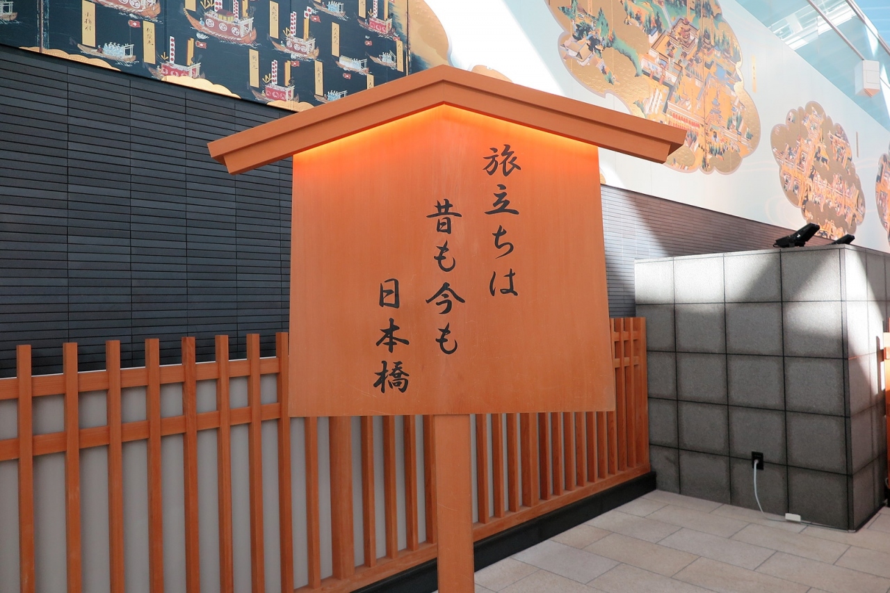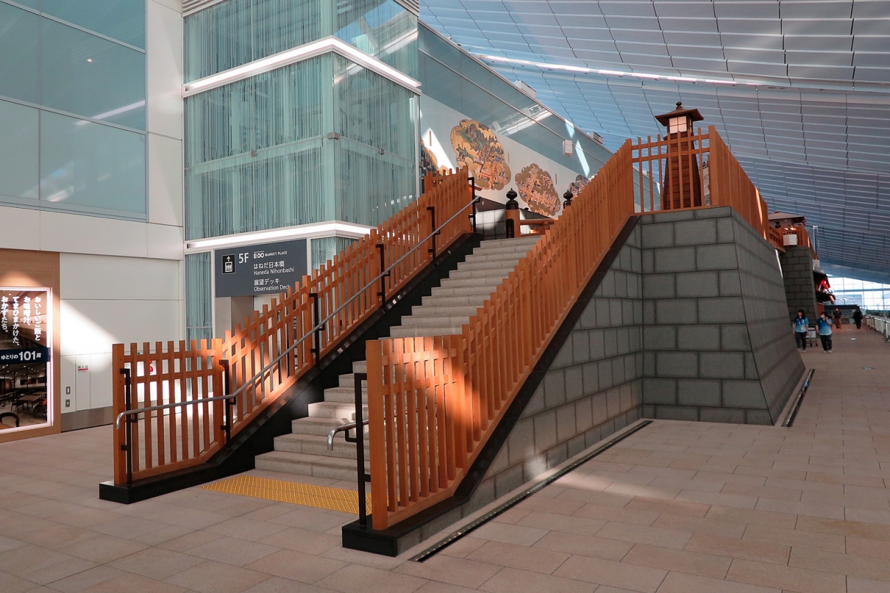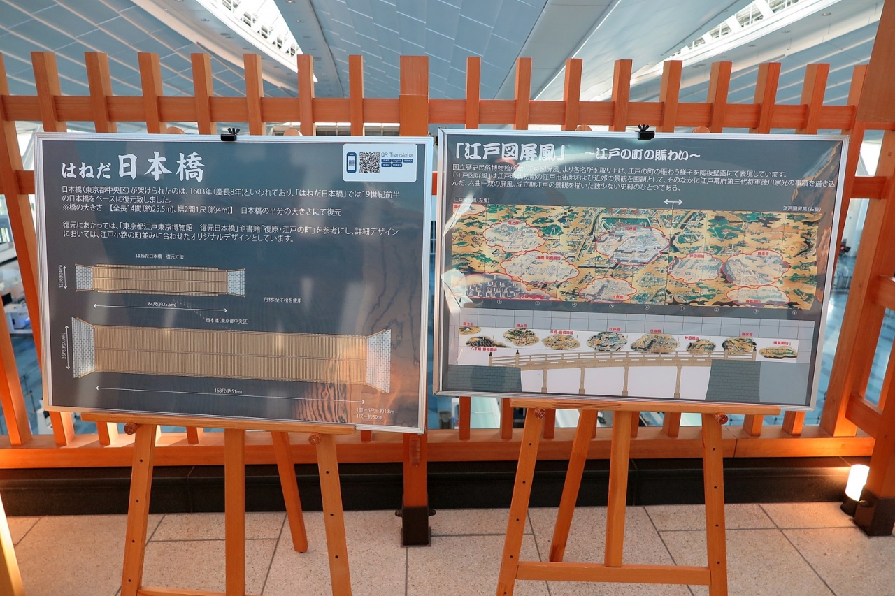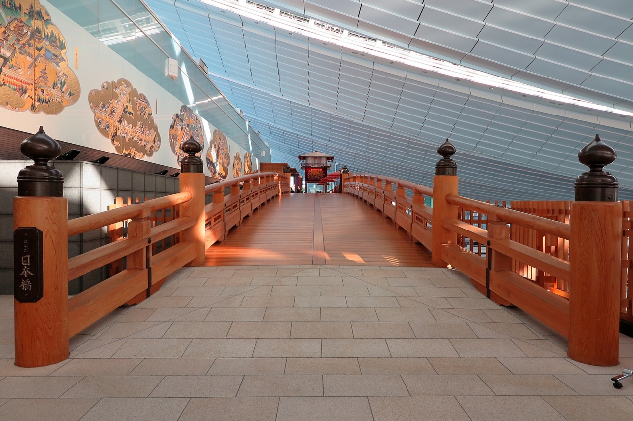 外国人観光を呼び込み、人口減少が進む日本にお金を落としていってもらおうとする国の政策によって羽田空港の再国際化・再整備が進んでいきましたが、こちらの「はねだ日本橋」も、そうした中で生まれたアトラクションなのでしょうね。外国人利用客にとっても日本文化をイメージさせやすいものですし、日本人利用客にとっても、一度は渡りたいと思わせる造りの良さはさすが、パンフレットまであるという洒落が効いているのも素晴らしい!