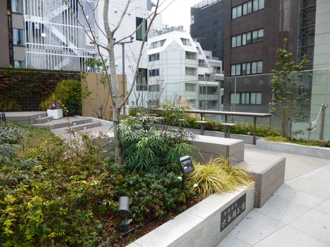 首都高の新京橋の出口のそば、ずっと工事が続いていましたが、昨年4月に工事が終了、オープンしました。建物に近づいて見ると1階から3階が保育園になっているようで、屋上が水谷橋公園となっていました。エレベーターで上がる面白い公園です。横には階段もあるので運動を兼ねて上がっても。芝生やベンチ、遊具が置かれていて、大人も子供もちょっと一息入れられる公園でした。