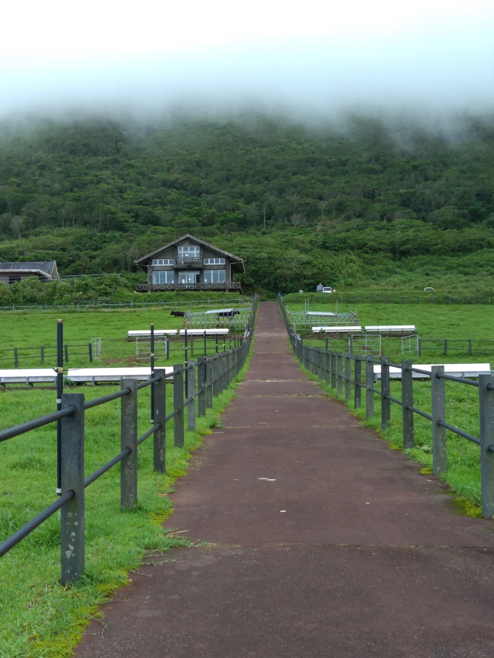 登山道入口から、登り(1h)、お鉢巡り(1h)、降り(1h)が標準行程なので、それでアクセスするつもりで、入口からはトイレがないので、ふれあい牧場にまず自転車でむかいました。やっぱり牧場も標高がすこしあるので、ガスってすごい視界が曇ってきて、天候が急にわるくなりました。そのため、入口あたりで断念。登山口から頂上までは1,280段をあがっていくそうです。この八丈富士は島のあちこちから見えて、八丈島らしい風景。