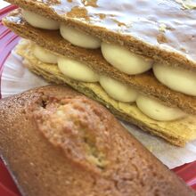 薄め、かつ硬めのパイにたっぷりのカスタードクリームがサンドしてある。