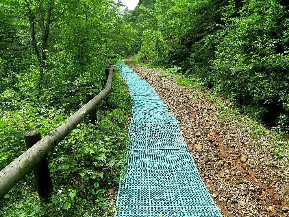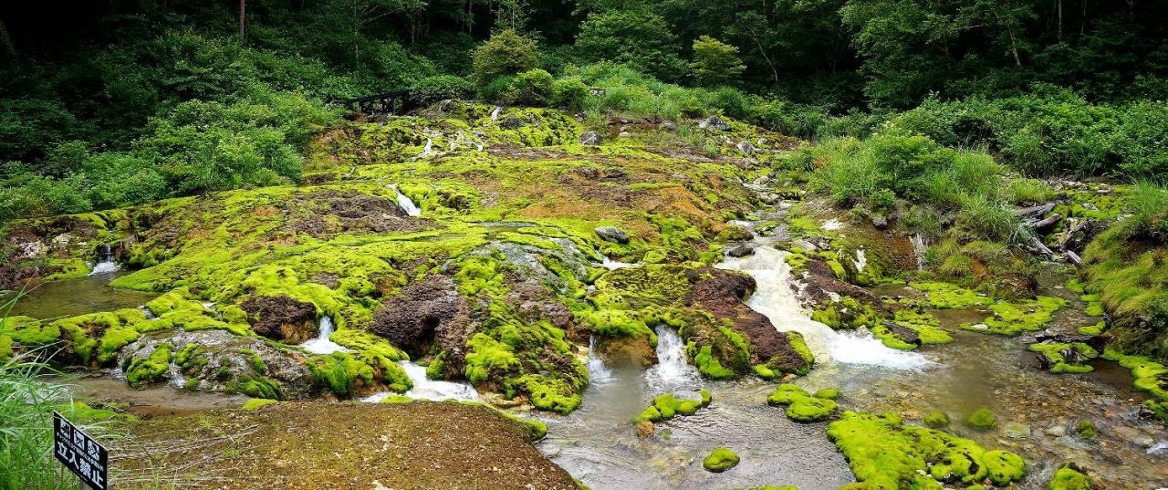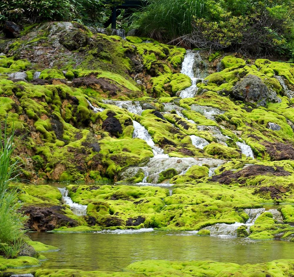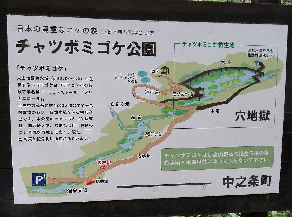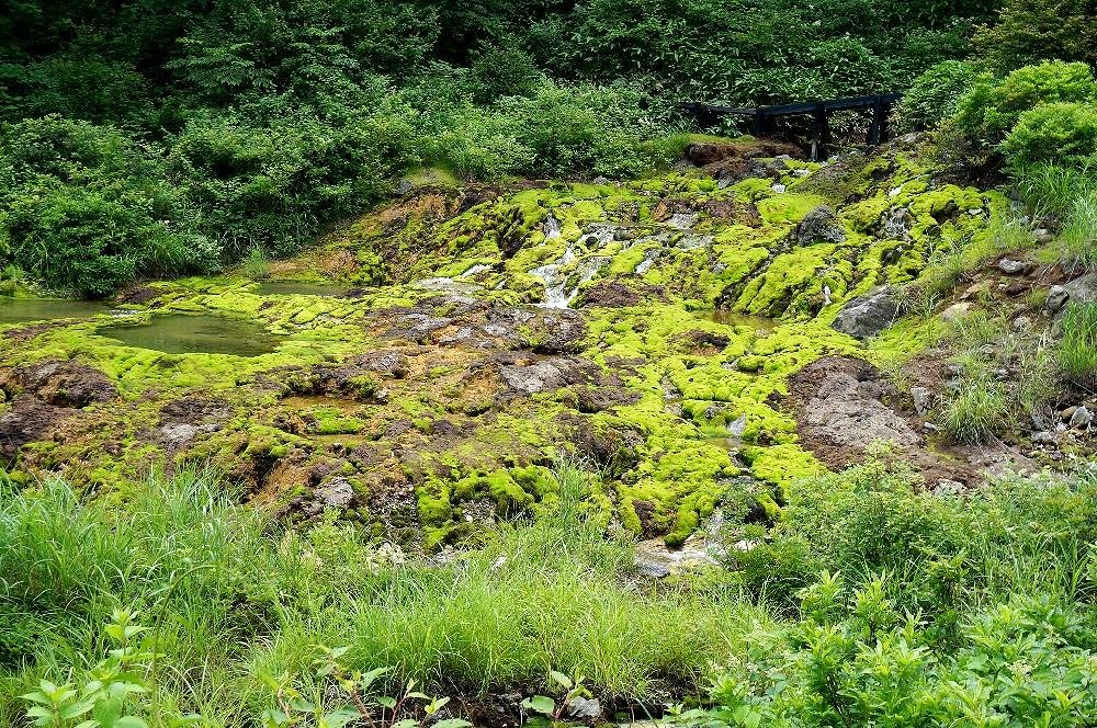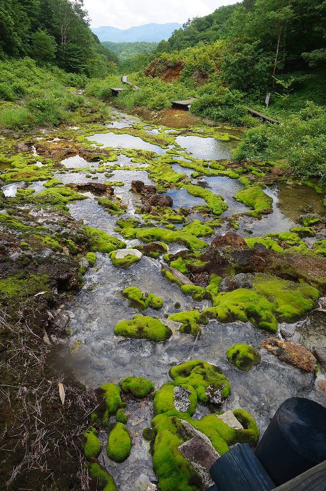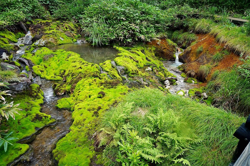 梅雨明け宣言が出された7月中旬に訪れました。不便なところにあるので、車でどうアプローチすればよいかと迷いました。野反湖からの帰りに立ち寄りましたが、最短の55号線は道が狭そうだったので、その少し先のガソリンスタンド横の道を右折する迂回路を選びました。こちらはなんとか対向車があっても大丈夫すれ違える道でした(幸い空いていたので狭いところでは会いませんでした)。車は駐車場までは入れて、その先1.3キロ歩くか、1キロをシャトルバス(入園料600円に含まれている)に乗リ、その先300m歩くかを選ぶことになります。私達は暑かったので迷わずバスに乗りました。山道の1キロはけっこうきつそうでした。バス停からはチャツボミゴケのある穴地獄までは坂道を少し登ります。湯水の流れる川沿いの道は暑いときはきついです。穴地獄の苔は長雨のあとだっただけに、緑が鮮やかで、幻想的でした。ツツジのころか紅葉のきれいな時にも訪れるといいと思いました。