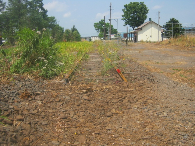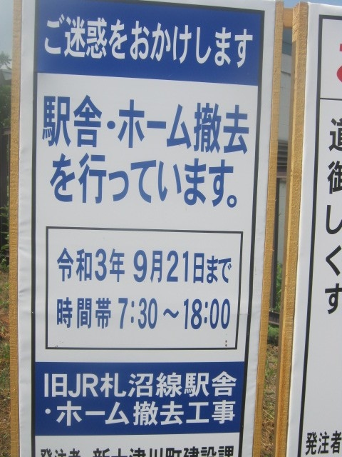 今回は2021年7月20日、夏の18きっぷシーズンの初日に、旧新十津川駅周辺の様子を確認に出かけました。前回は同年4月上旬のことでしたが、この時はまだ雪が残っている時期で、駅舎もその周辺も現役時代そのままの風情でしたが、やはり本格的な夏を迎えて工事も急ピッチで進んでいる感じで、今回の訪問時点では、まず、旧ホーム付近の約100mを残した状態で、レールの撤去も視界の範囲内で完了している感じで、旧駅舎内のベンチなどの撤収も完了し、後は解体を待つのみ、といった状態でした。