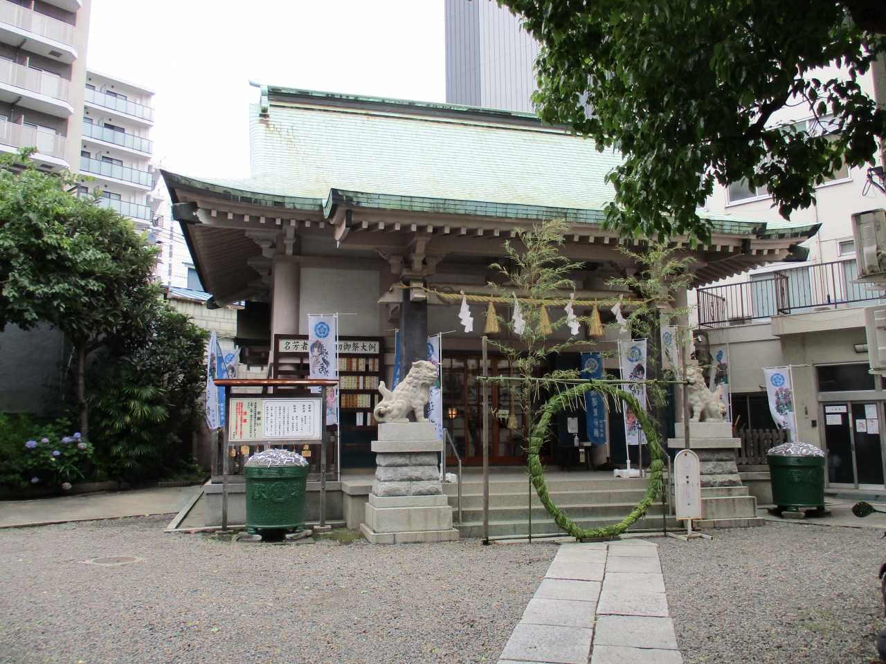 浅草橋から蔵前方面に向かって散歩をしていた時に、神社があったのでお詣りがてら寄ってみました。それほど規模が大きな神社ではありませんでした。境内にはまだ青々とした茅の輪が造られていて、早速、コロナ禍なので無病息災、疫病退散を祈願しながらお詣りすることができたので満足でした。