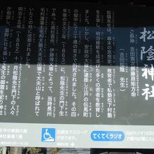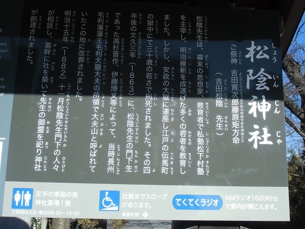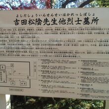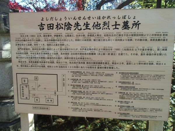 説明板によると、死の4年後の文久3年(1863)に、松陰の門下生であった高杉晋作、伊藤博文等によって、当時長州毛利藩主毛利大膳太夫の所領で大夫山と呼ばれていたこの地に改葬されました。