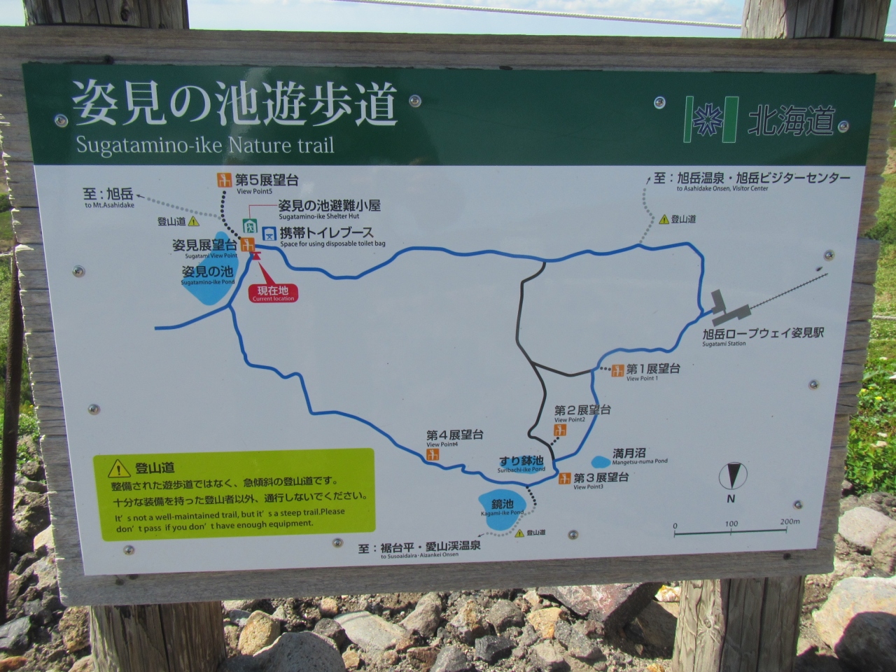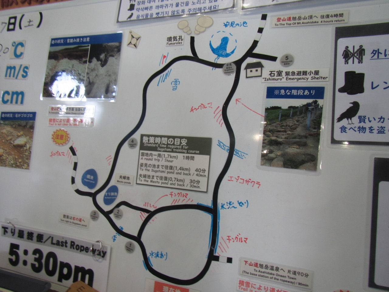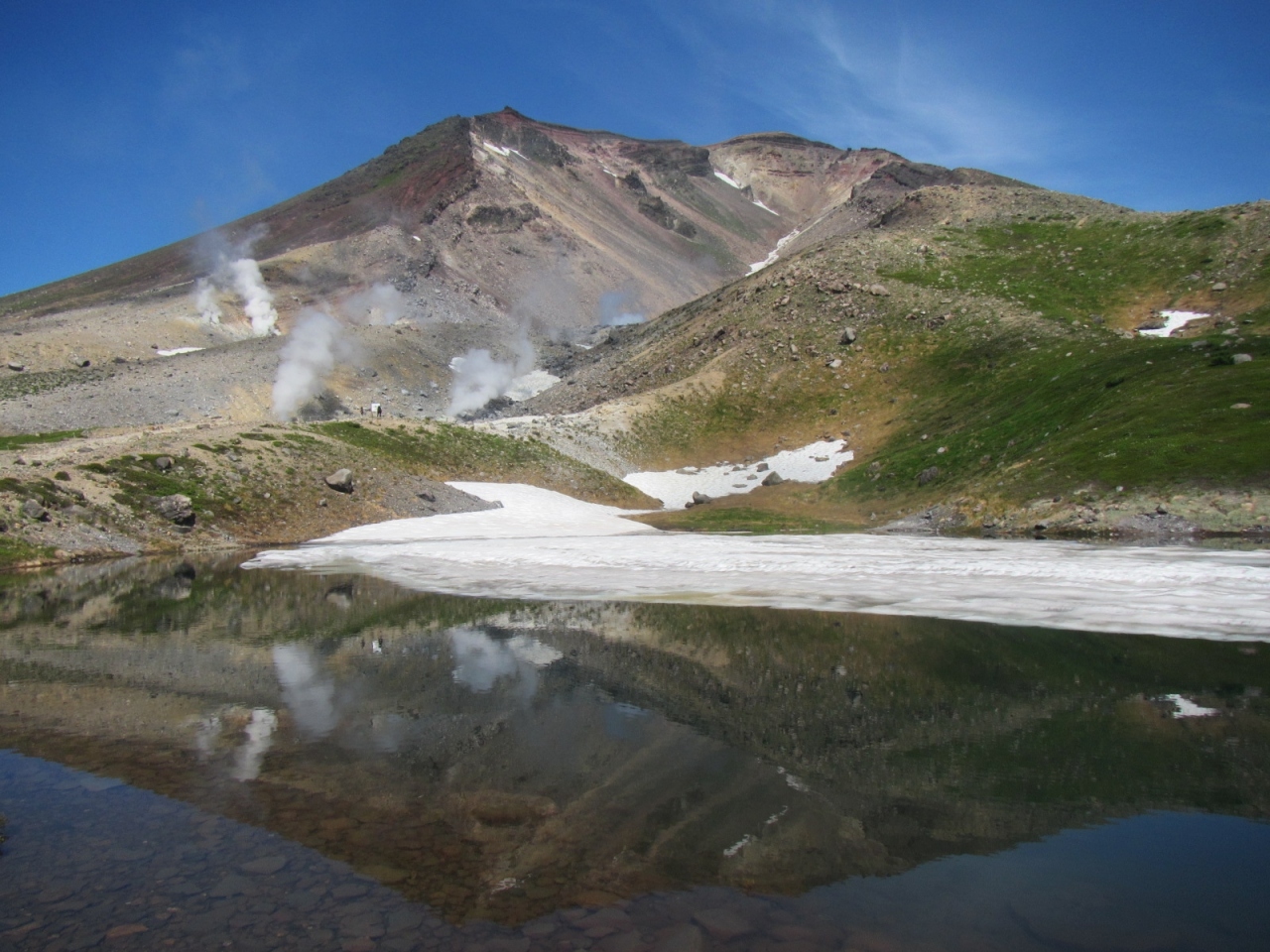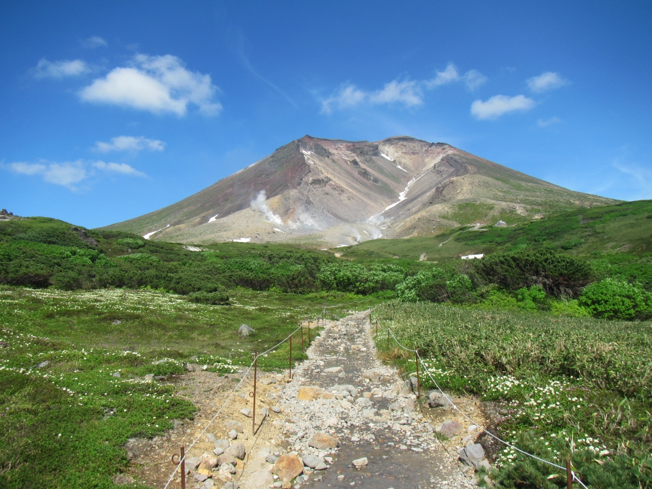 運良く午後も晴れていれば、姿見の池あるいはチングルマの群落の背景に正面から光を受けて明るく輝く旭岳の雄姿を眺めることができます。