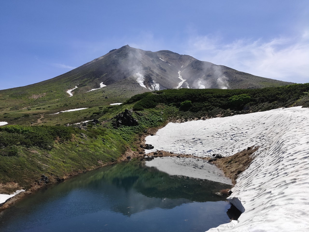 山の天気は午後の方が悪化することが多くて難しいのですが、ここから眺める旭岳は、午後の方が山の正面から日が当たって山が明るく輝きます。