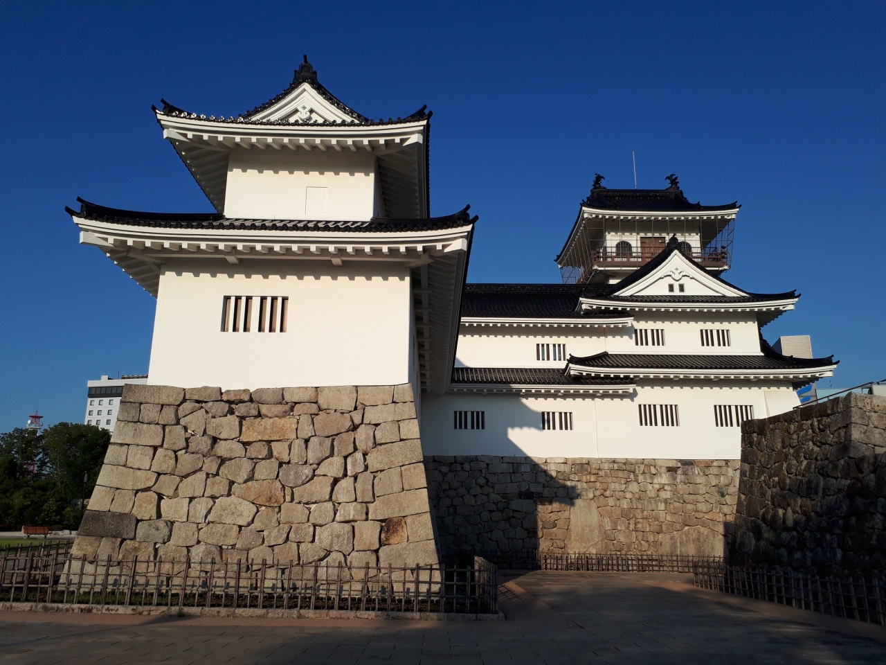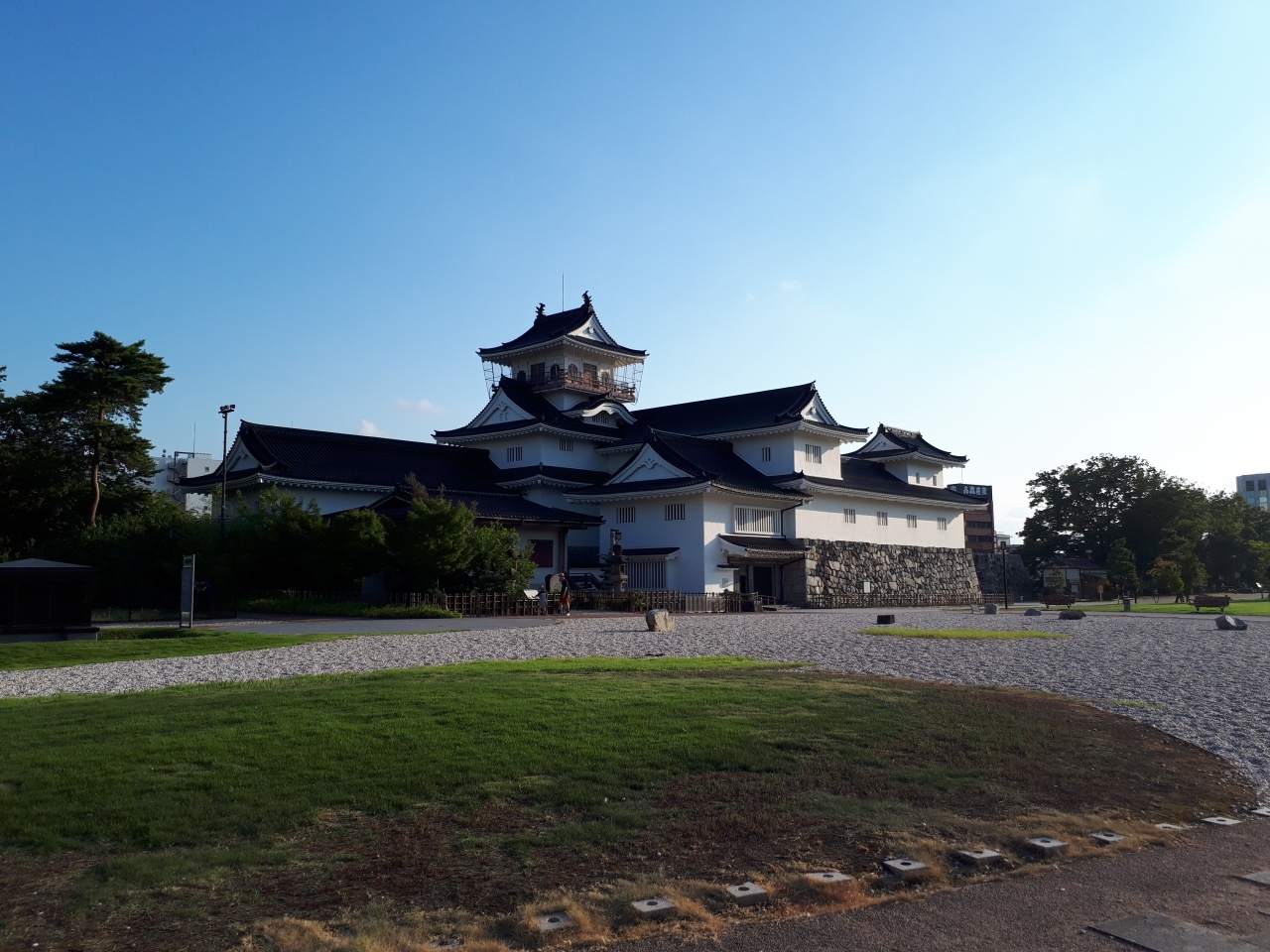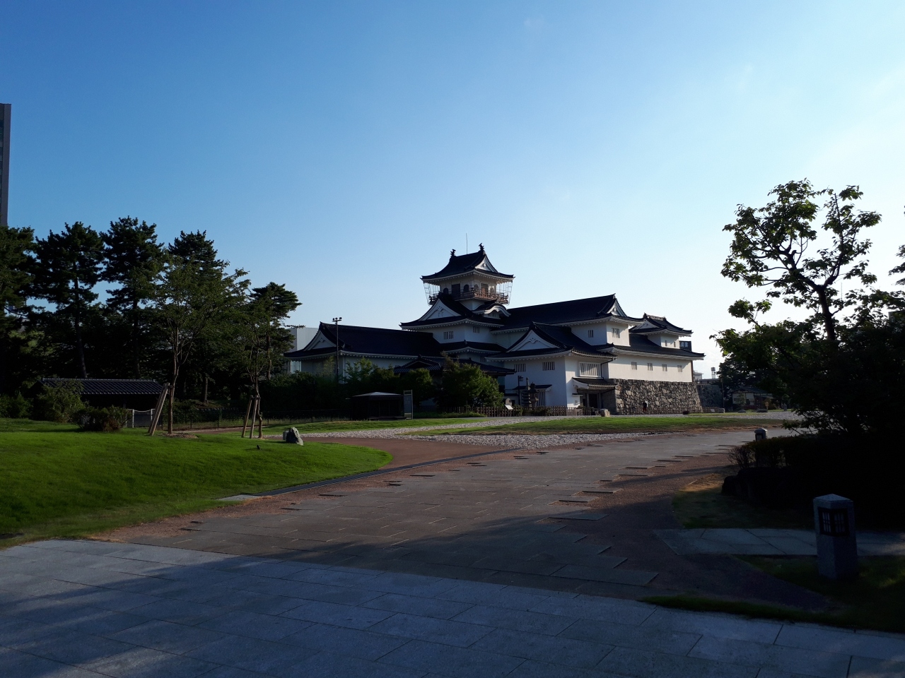お城は中くらいの大きさ。石垣やお堀もあり、お城らしさがあります。