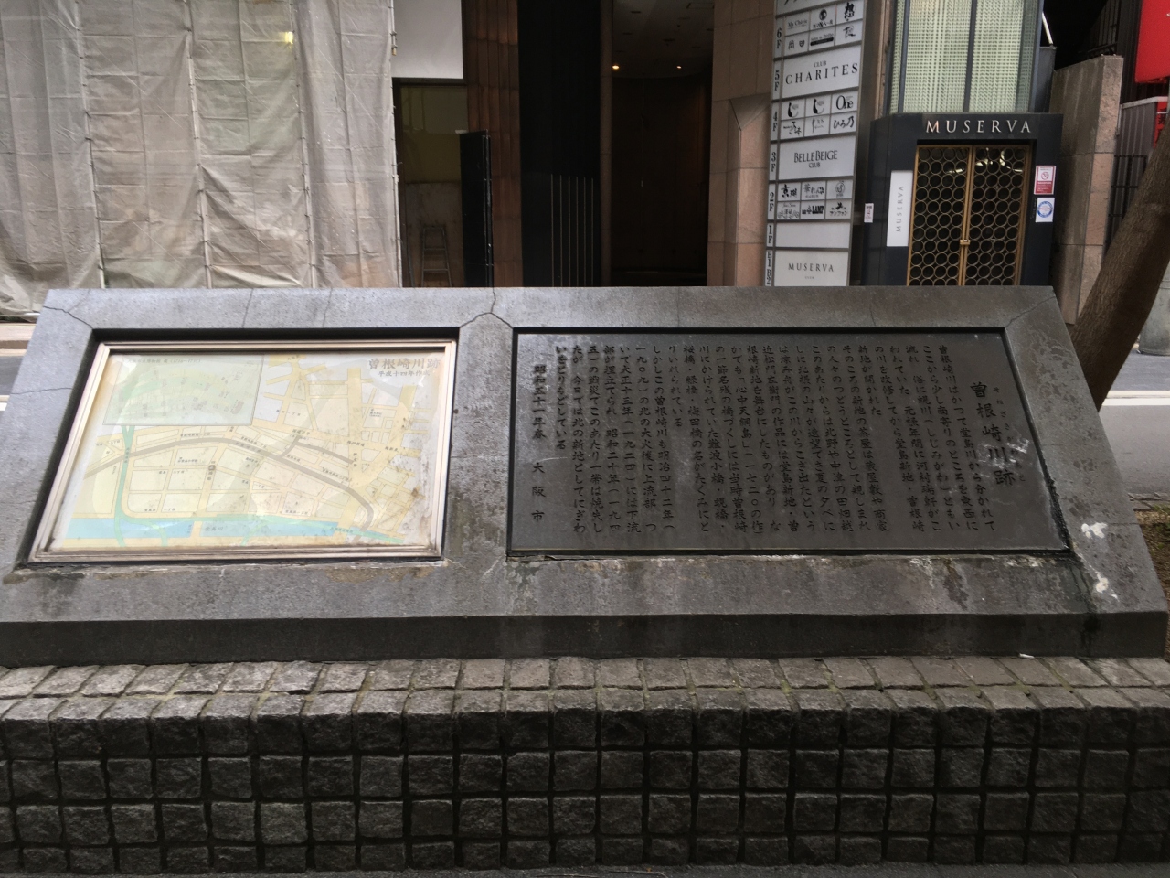 曽根崎川は東西へと伸びる堂島川から分かれた支流で、蜆川、梅田川、下流では福島川ともいわれていました。1909年にあった北の大火後に上流部が埋めたてられ、1924年にはすべて消滅しました。現在は飲食店が立ち並ぶ繁華街となっていて、記念碑が残るのみとなっています。