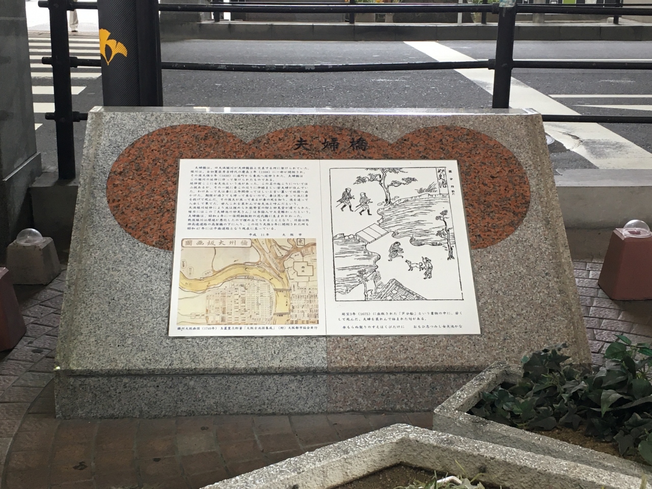 天神橋筋商店街を南に進み、3丁目と4丁目の境にある阪神高速の下にあります。天神橋筋商店街を散策している途中に通りました。以前は堀川が流れていましたが、戦後に環境が悪化したとのことで埋め立てられることになり、現在は川はなく橋の欄干が復元されています。高速下にあるためか、薄暗くあまり環境が良いようには見えませんでした。