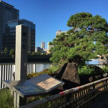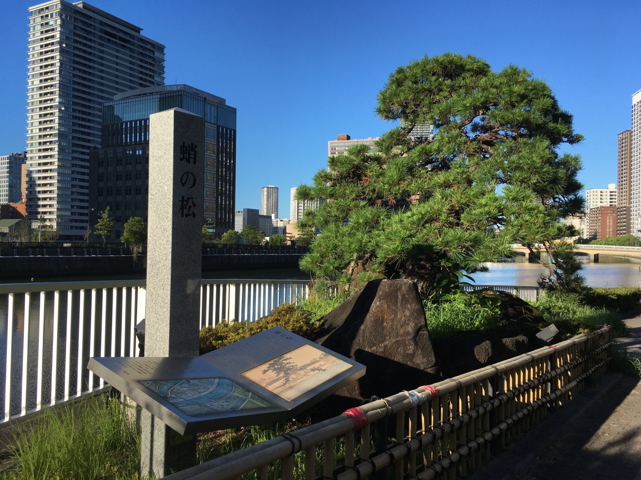 堂島川と土佐堀川に囲まれた中之島エリアを散策中に立ち寄りました。堂島川の右岸,、田蓑橋北詰のたもとに枝振りの良い松が1本植えられています。枝振りが蛸の泳ぐ姿に見えるということから「蛸の松」と呼ばれるようになり、その松の木は福島正則が植えたといわれているとのこです。現在の蛸の松は2004年に護岸工事の一環として植えられました。