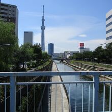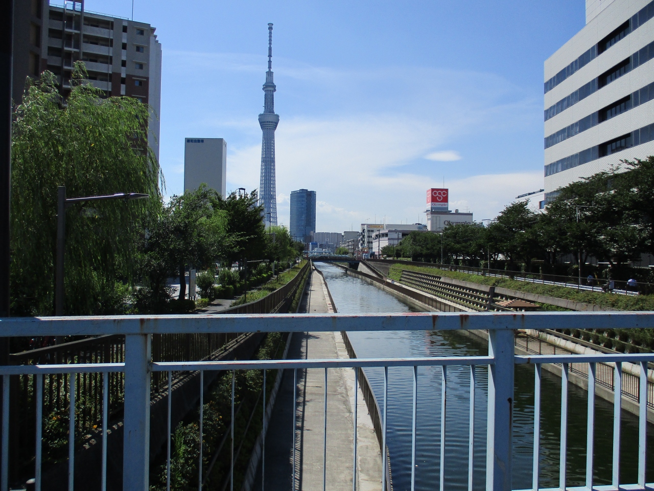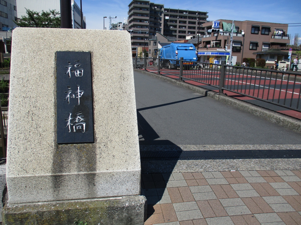 明治通りを亀戸から小村井に向かって散歩していた時に、北十間川に架かる橋を渡りました。福神橋という名前の橋で、メイン道路なので交通量はとても多い場所でした。橋の上からは少し離れていますが、スカイツリーも見ることができました。