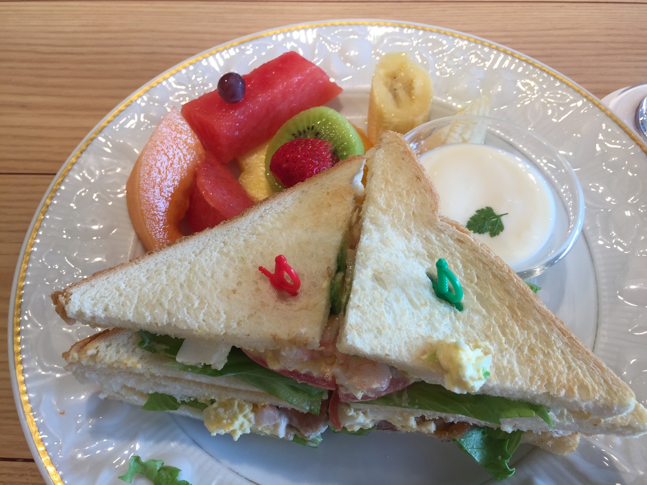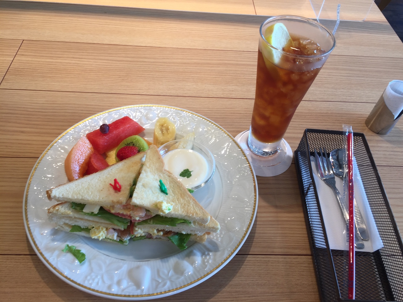 サンドイッチのランチにしたが サンドイッチもチキン エビ アボカド トマトでキチンと美味しく 質の良いフルーツもいろいろ付いて 小さなヨーグルト 飲み物付きで 800円台とは驚きの安さ!