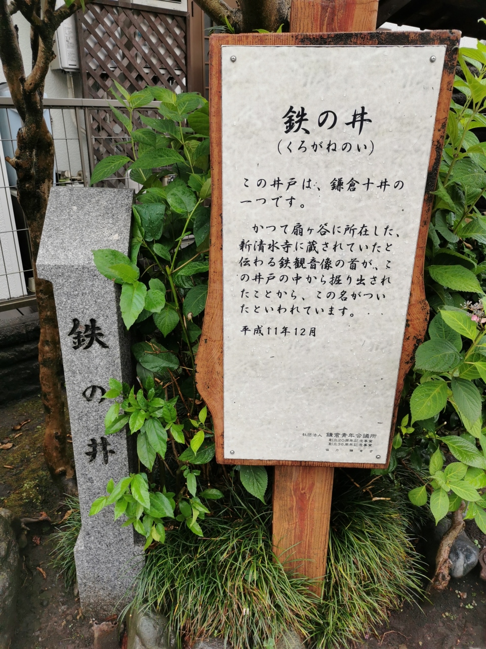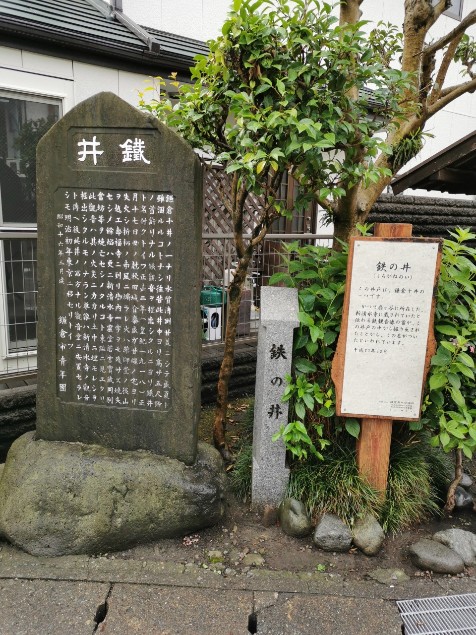 鎌倉観光。早朝車を駐車場にとめてから自転車で散策です。段葛を通って鶴岡八幡宮の境内へ。大鳥居前の国道を左手へ。小町通りに抜ける細道の入り口に鉄の井(くろがねのい)がありました。特に特徴が感じられないので、看板がないと素通りしてしまいそうです。