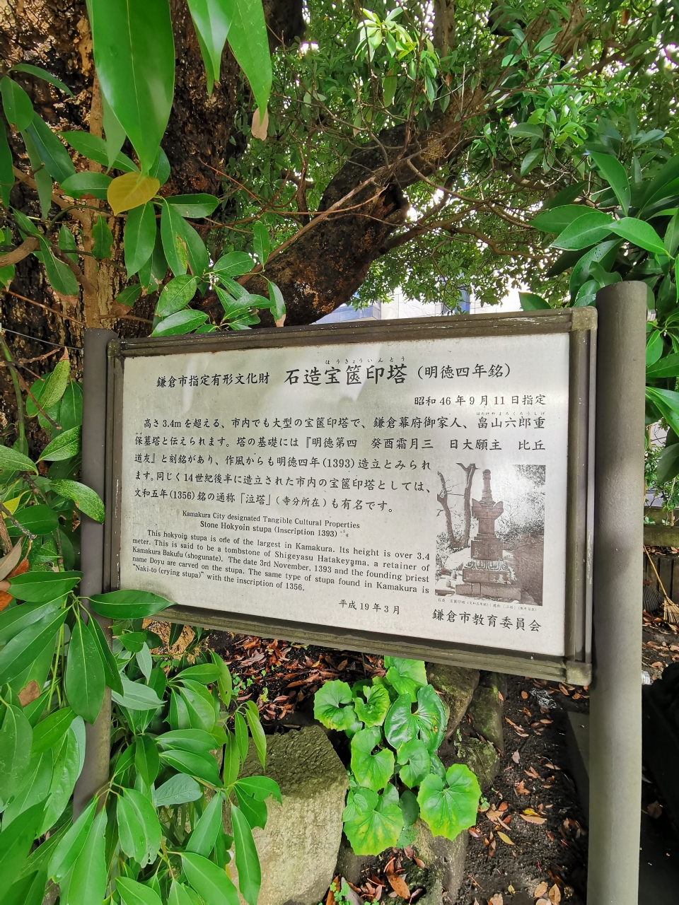 鎌倉観光。早朝車を駐車場にとめてから自転車で散策です。鶴岡八幡宮を参拝。小町通りから鎌倉駅ほ通って若宮大路を材木座海岸に向けて走ると石造りの鶴岡八幡宮の大鳥居(一の鳥居)があります。一の鳥居の横の歩道に石造宝篋印塔がありました。鎌倉市の指定文化財との事です。1393年造立との事でかなり古い感じを受けました。