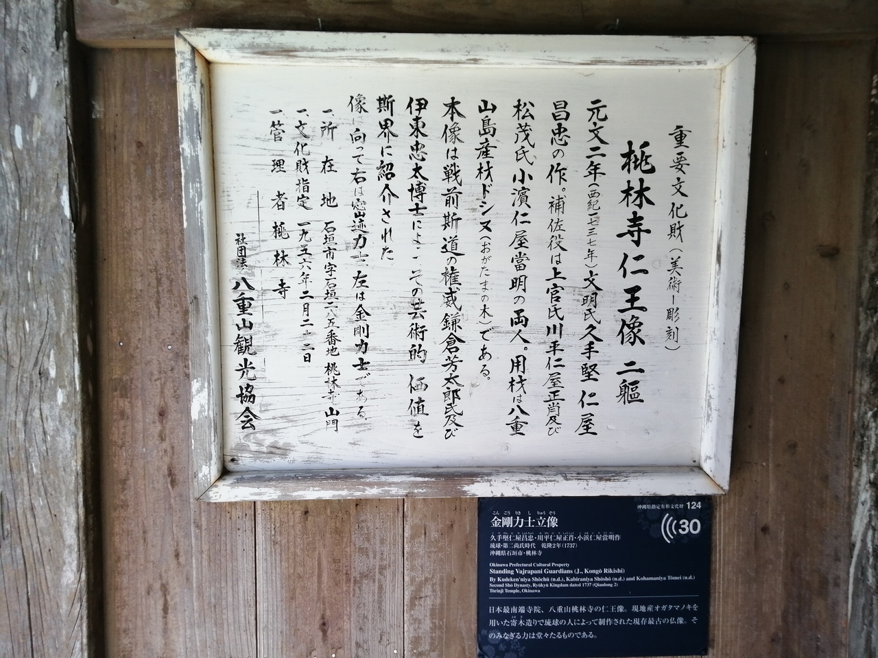 八重山諸島最古の寺院である桃林寺の山門の中に納められています。この仁王像も元文2年(1737年)に作られたもので八重山最古の木造彫刻です。南国の強い日差しの中、山門内部は暗く、入るときには仁王像の存在に気が付きませんでした。よくよく考え山門の中をを覗いてみて見ることができました。せっかく桃林寺まで行ったのに仁王像を見ずに去ることのないようにして下さい。