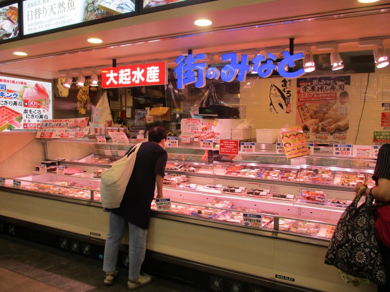 阪急高槻駅の構内、改札のすぐ近くにある大起水産のお店です。ショーケースにおいしそうなお寿司が並んでいます。訪れた時はうな丼もありました。意外にお値段はそれほど高くないなと思いました。買いやすい場所にあるので便利です。テイクアウトだけでなくイートイン席もあります。