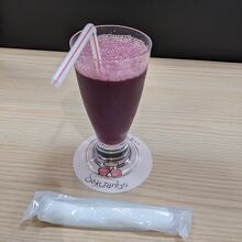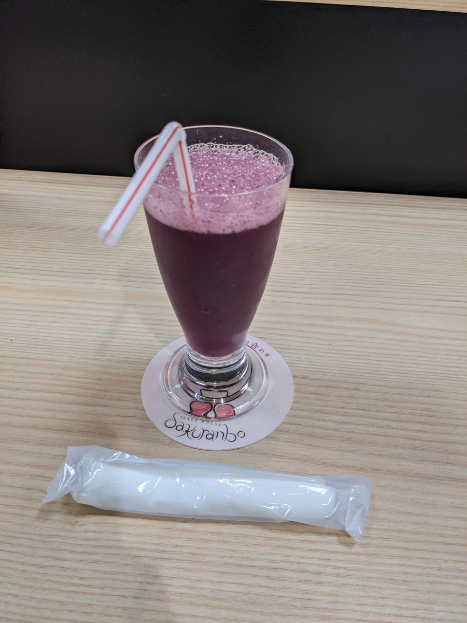 宮崎市内唯一のデパート、山形屋の地下一階のフルーツ屋に併設されています。千疋屋ほどではないと思うけどデパートなので高級志向です。ジュースは500円以上。パフェは千円以上しますが、品質は確かです。ブドウジュースがセールで660円になってました。おいしいです。
