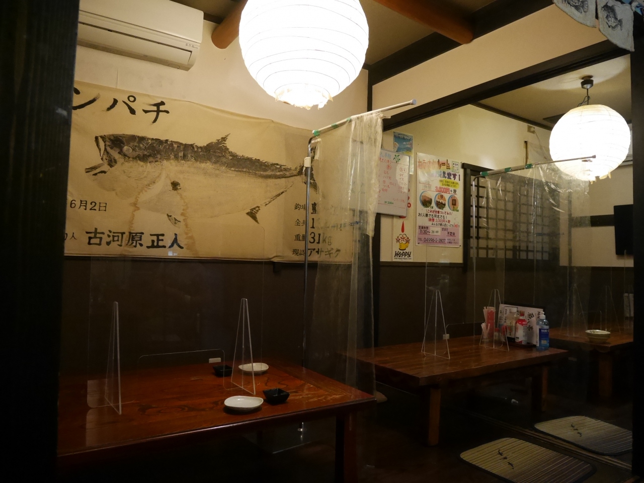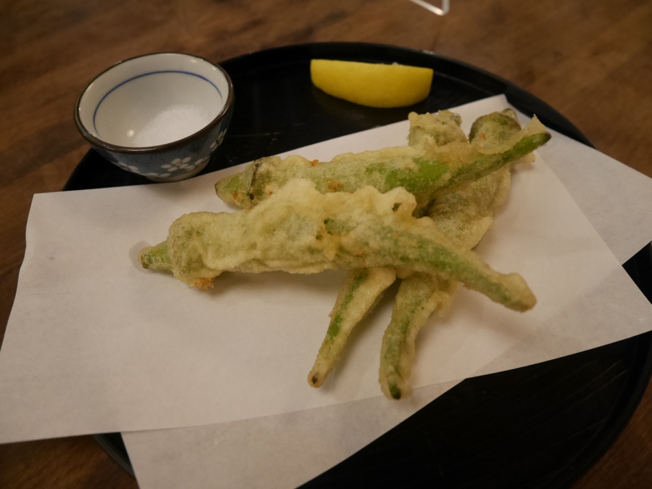 緊急事態宣言下のためアルコールは飲むことができず、ソフトドリンクとネリの天ぷら、お刺身の3点盛りを注文。ホワイトボードに書かれていた「カッポレ」という名前の魚は「シマアジ」に似たものだそうで、3点の中に入れてもらいました。