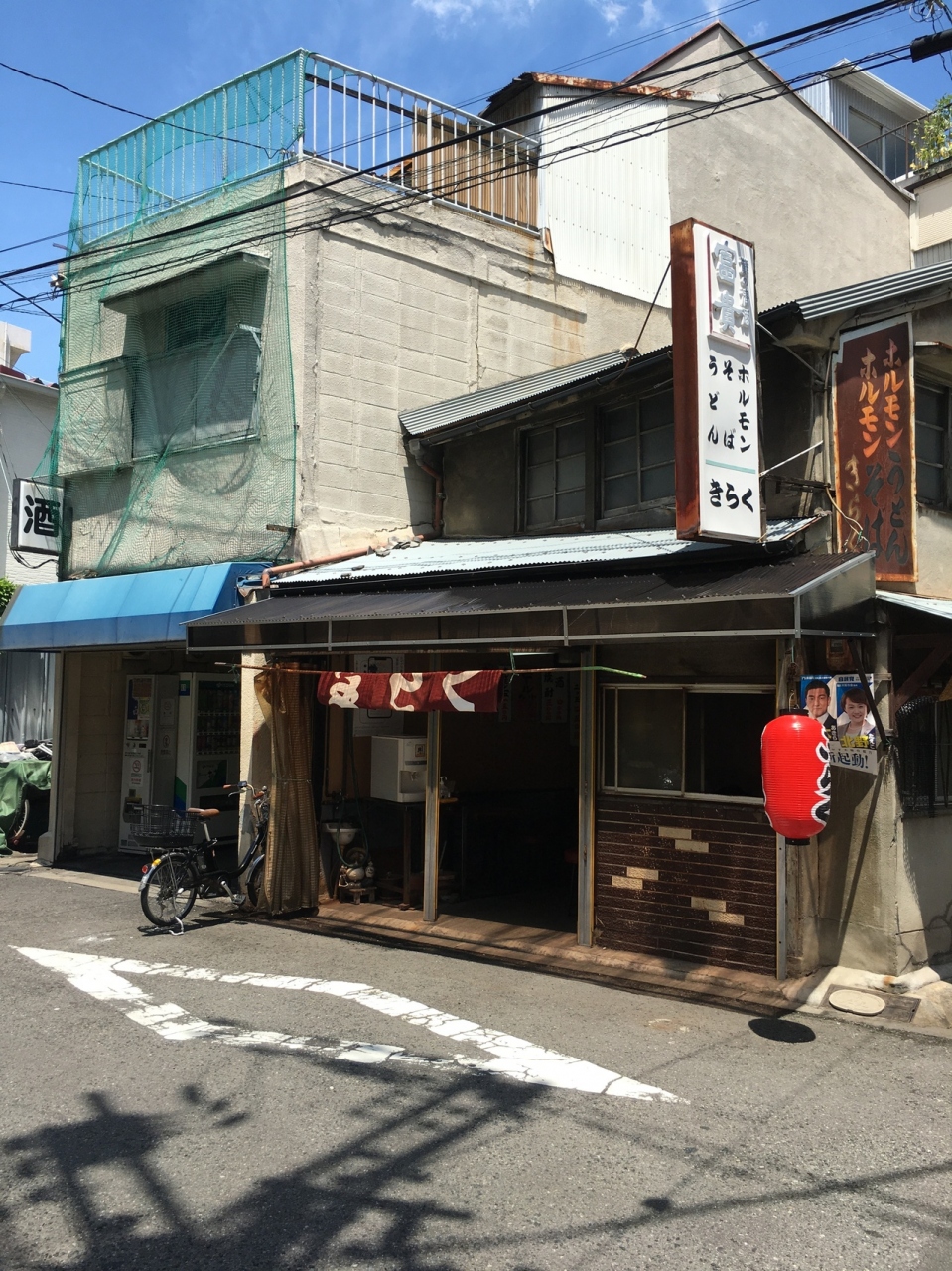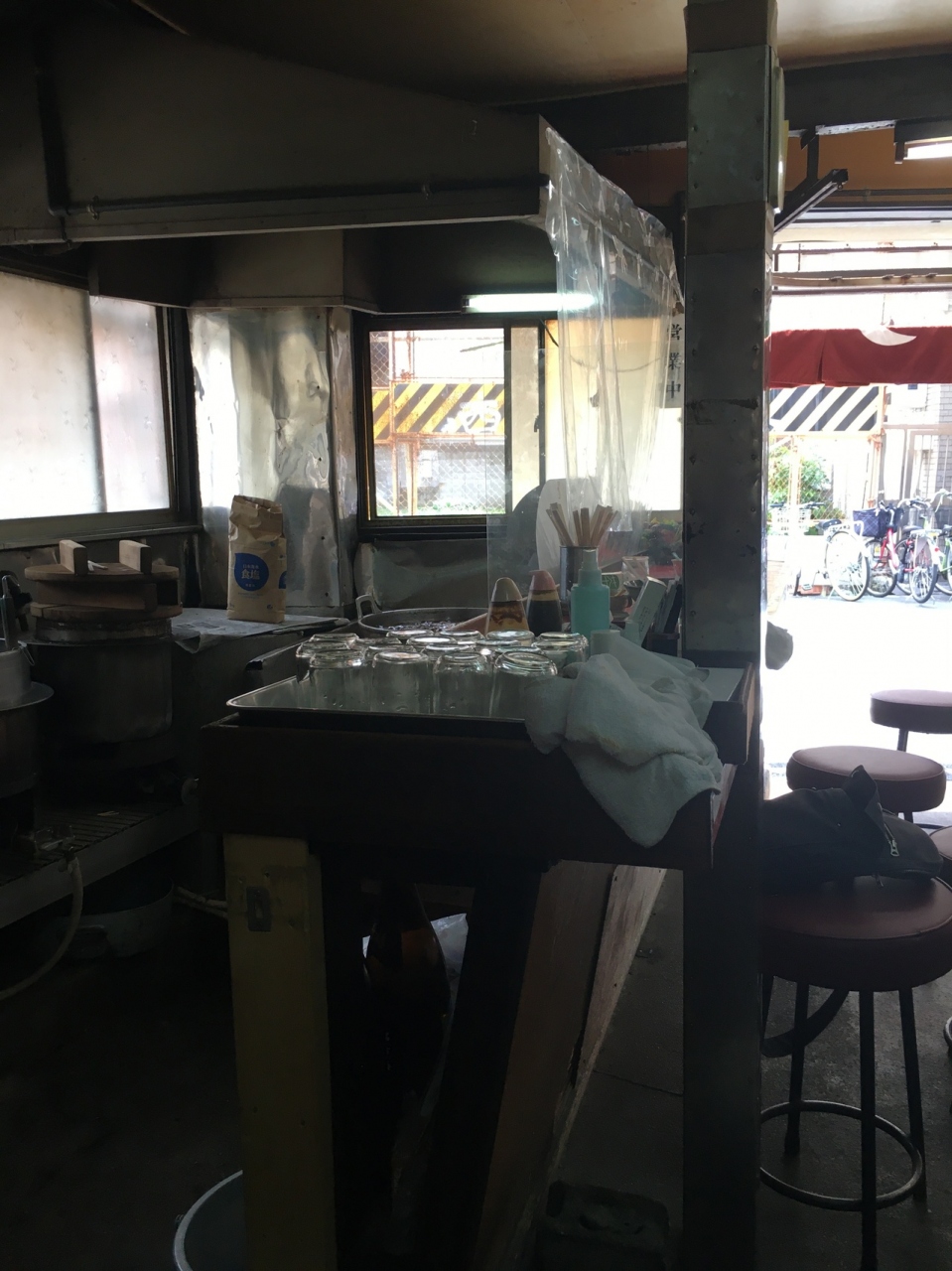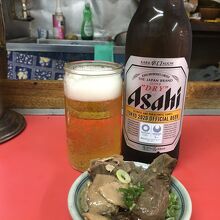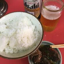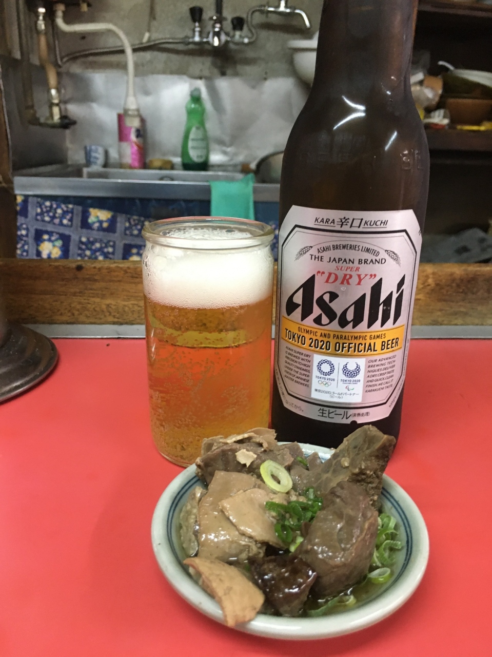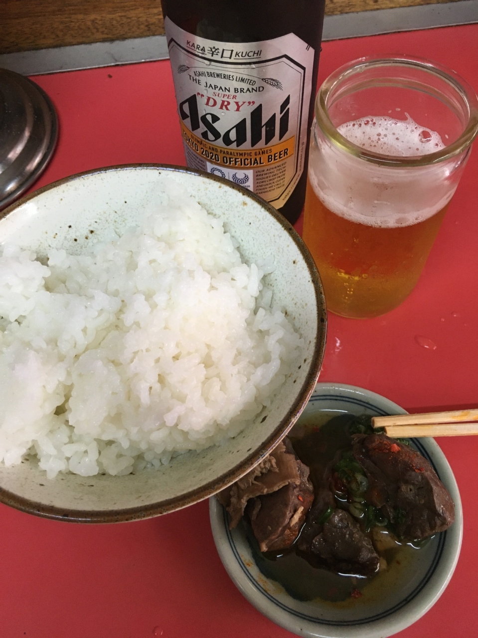 昭和時代から営業しそうな古びた味わいがある佇まい店でした。店頭の赤い提灯のみがやけに新しく感じました。エアコンがなく、大型扇風機が回っていて店内、ドア、窓は全開でした。壁にはメニューが貼ってあり、ビール小瓶と醤油皿ほどの器のホルモン1皿でちびちびやりました。さっぱりしたホルモンで、ご飯は150円ながら量が多かったです。もう一皿最後にホルモン皿追加しました。