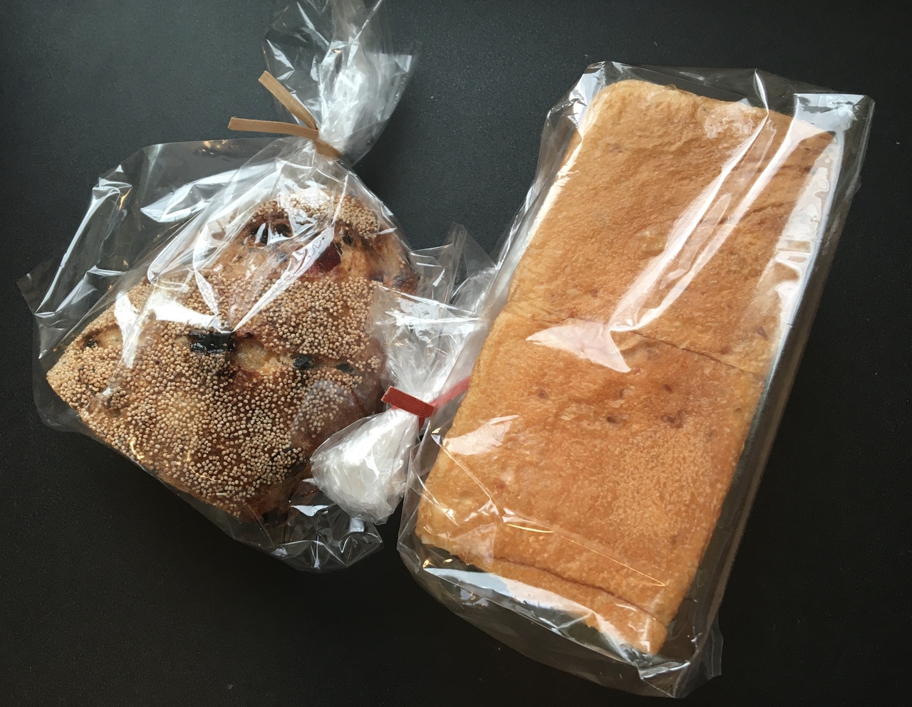 土曜日の夕方だったので、パンの種類は少なかったのですが、ドライフルーツがたっぷり詰まったカンパーニュと、木の実のパンを買いました。
