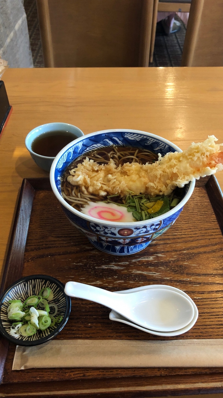 川崎大師の門前にある、有名な蕎麦屋さんです。明治17年の創業です。大きな海老天が1本よっている天ぷらそば1375円と、久寿餅440円を食べました。海老天の大きさはインパクトがありますが、値段は高めに感じました。久寿餅は、近くの久寿餅屋さんの物を提供しているようです。